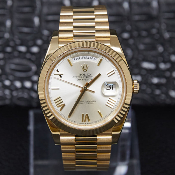 This Rolex Day-Date 40 228238 has a silver roman numeral dial and a bracelet strap. This Rolex has undergone a thorough inspection of water resistance, accuracy, functionality and condition to determine the level of reconditioning required to meet our strict standards. It has also been referenced against technical documents and manufacturer records where available to ensure authenticity and a clean history. Our watches have a 24-month warranty for your peace of mind, in conjunction with any remaining manufacturer’s warranty from new or from service. To maintain the manufacturer’s warranty on this watch, it has not been polished in our service centre.