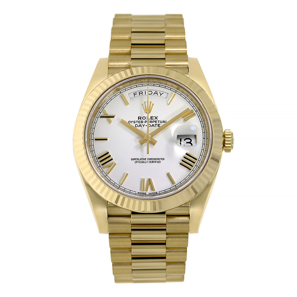 This Rolex Day-Date 40 228238 has a white roman numeral dial and a bracelet strap. This Rolex has undergone a thorough inspection of water resistance, accuracy, functionality and condition to determine the level of reconditioning required to meet our strict standards. It has also been referenced against technical documents and manufacturer records where available to ensure authenticity and a clean history. All our watches have a 24-month warranty for your peace of mind. One of our skilled polishing technicians has removed marks on the case and bracelet of this watch, brought about by daily wear and tear, which is why this watch does not come with the remaining manufacturer’s warranty.