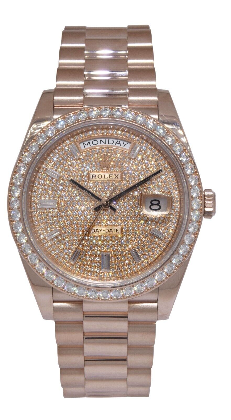 This Rolex Day-Date 40 228345 RBR has a diamond paved dial and a bracelet strap. This Rolex has undergone a thorough inspection of water resistance, accuracy, functionality and condition to determine the level of reconditioning required to meet our strict standards. It has also been referenced against technical documents and manufacturer records where available to ensure authenticity and a clean history. All our watches have a 24-month warranty for your peace of mind. One of our skilled polishing technicians has removed marks on the case and bracelet of this watch, brought about by daily wear and tear, which is why this watch does not come with the remaining manufacturer’s warranty.