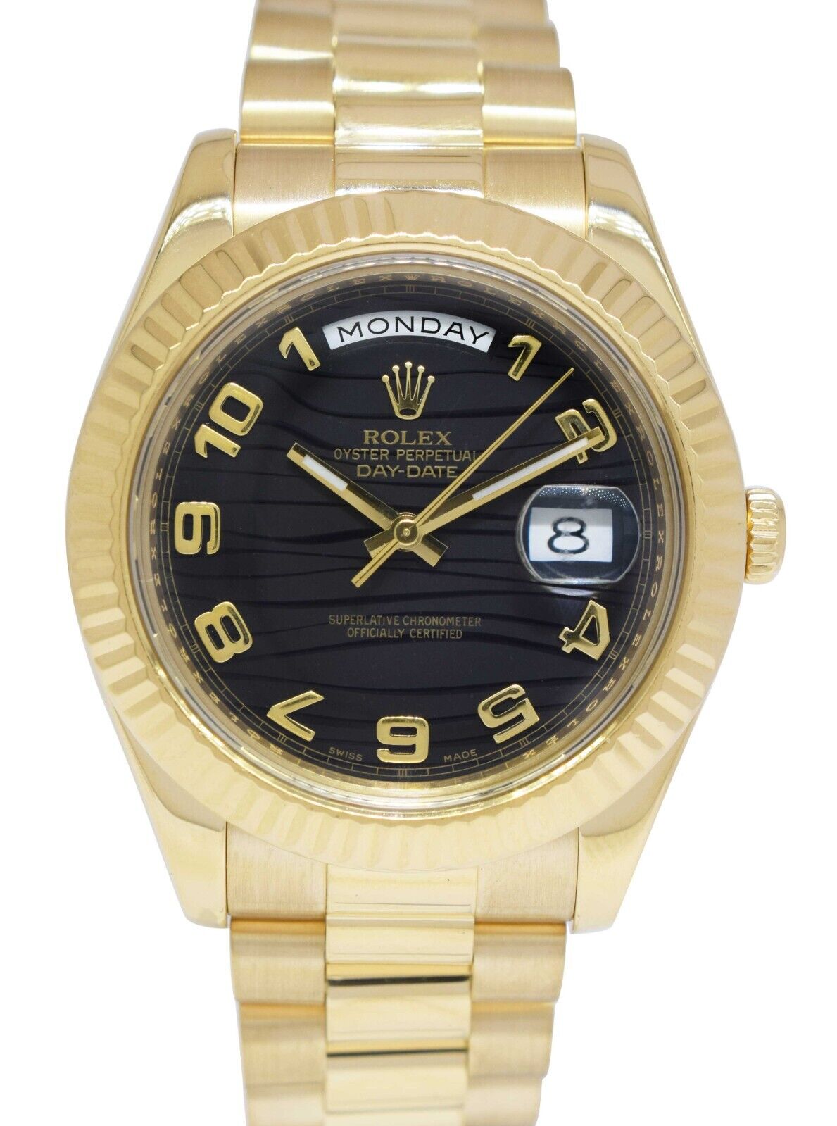 This Rolex Day-Date II 218238 has a black wave arabic dial and a bracelet strap. This Rolex has undergone a thorough inspection of water resistance, accuracy, functionality and condition to determine the level of reconditioning required to meet our strict standards. It has also been referenced against technical documents and manufacturer records where available to ensure authenticity and a clean history. All our watches have a 24-month warranty for your peace of mind. One of our skilled polishing technicians has removed marks on the case and bracelet of this watch, brought about by daily wear and tear, which is why this watch does not come with the remaining manufacturer’s warranty.