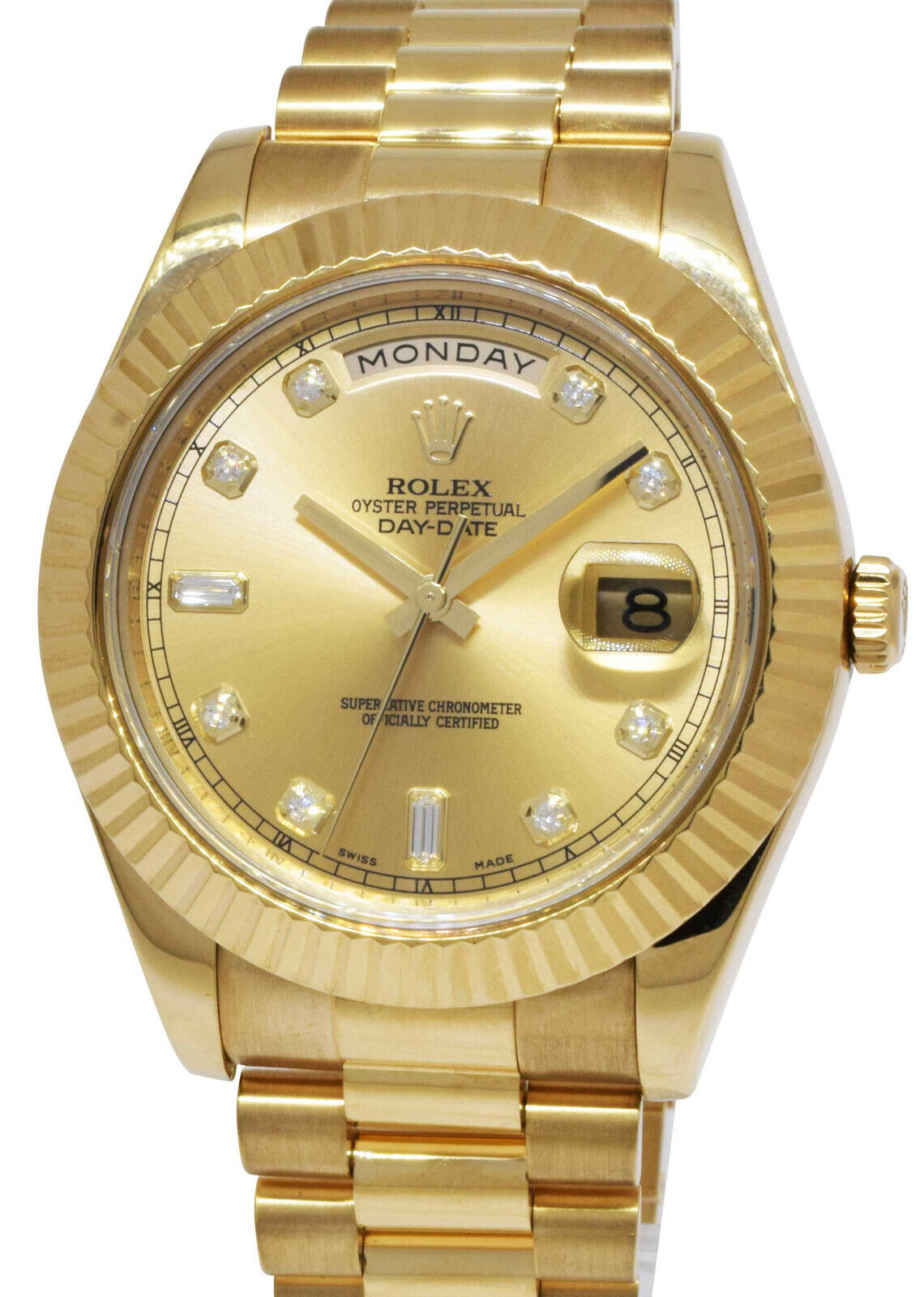 This Rolex Day-Date II 218238 has a champagne diamond dial and a bracelet strap. This Rolex has undergone a thorough inspection of water resistance, accuracy, functionality and condition to determine the level of reconditioning required to meet our strict standards. It has also been referenced against technical documents and manufacturer records where available to ensure authenticity and a clean history. All our watches have a 24-month warranty for your peace of mind. One of our skilled polishing technicians has removed marks on the case and bracelet of this watch, brought about by daily wear and tear, which is why this watch does not come with the remaining manufacturer’s warranty.