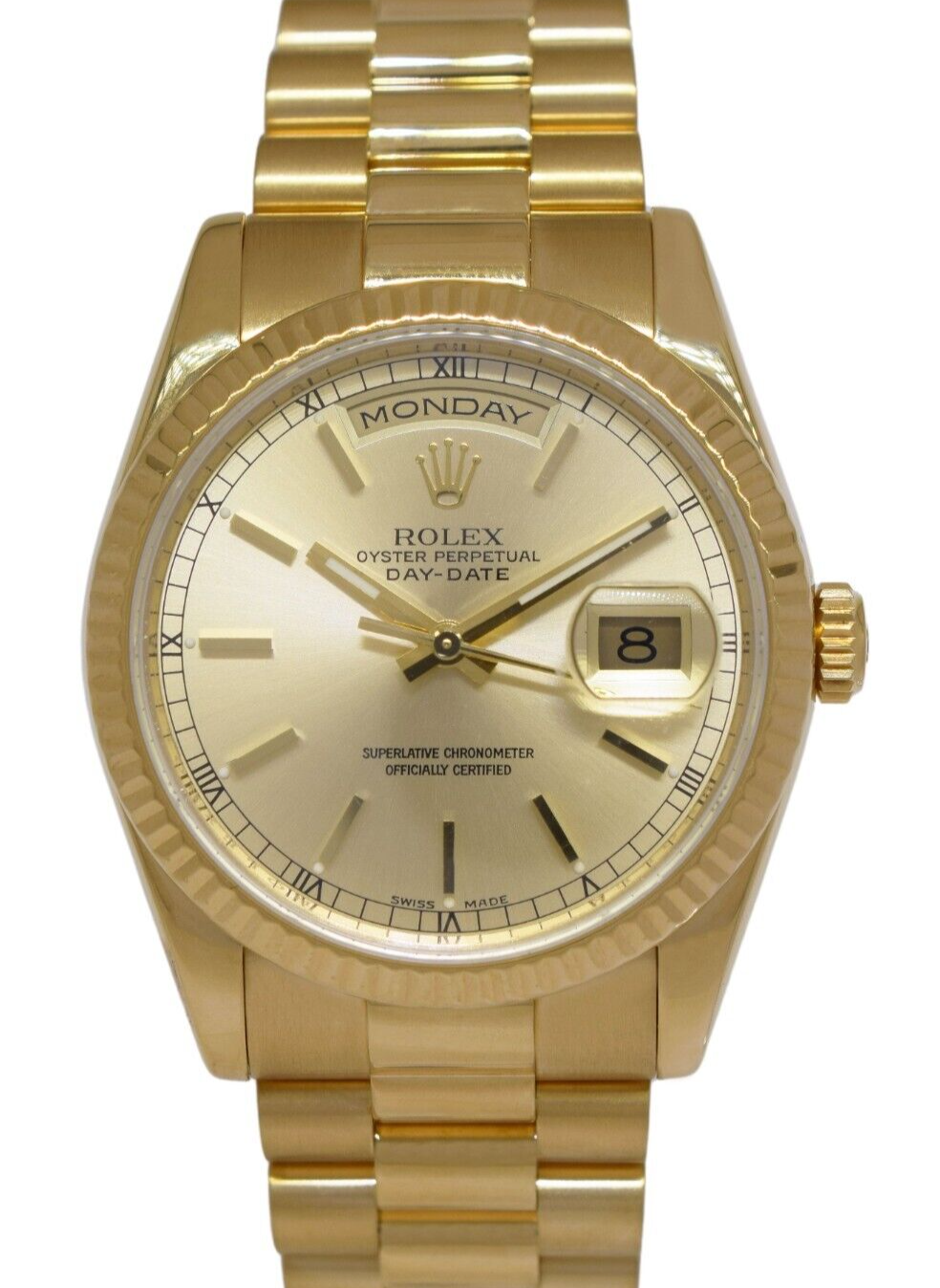 This Rolex Day-Date 118238 has a champagne baton dial and a bracelet strap. This Rolex has undergone a thorough inspection of water resistance, accuracy, functionality and condition to determine the level of reconditioning required to meet our strict standards. It has also been referenced against technical documents and manufacturer records where available to ensure authenticity and a clean history. All our watches have a 24-month warranty for your peace of mind. One of our skilled polishing technicians has removed marks on the case and bracelet of this watch, brought about by daily wear and tear, which is why this watch does not come with the remaining manufacturer’s warranty.