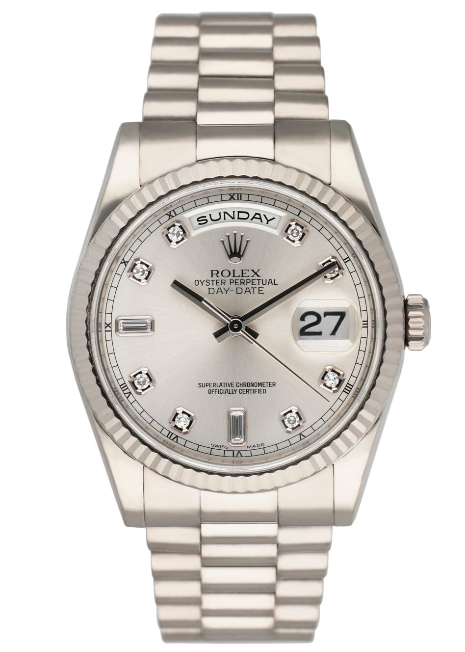 This Rolex Day-Date 118239 has a silver diamond dial and a bracelet strap. This Rolex has undergone a thorough inspection of water resistance, accuracy, functionality and condition to determine the level of reconditioning required to meet our strict standards. It has also been referenced against technical documents and manufacturer records where available to ensure authenticity and a clean history. All our watches have a 24-month warranty for your peace of mind. One of our skilled polishing technicians has removed marks on the case and bracelet of this watch, brought about by daily wear and tear, which is why this watch does not come with the remaining manufacturer’s warranty.