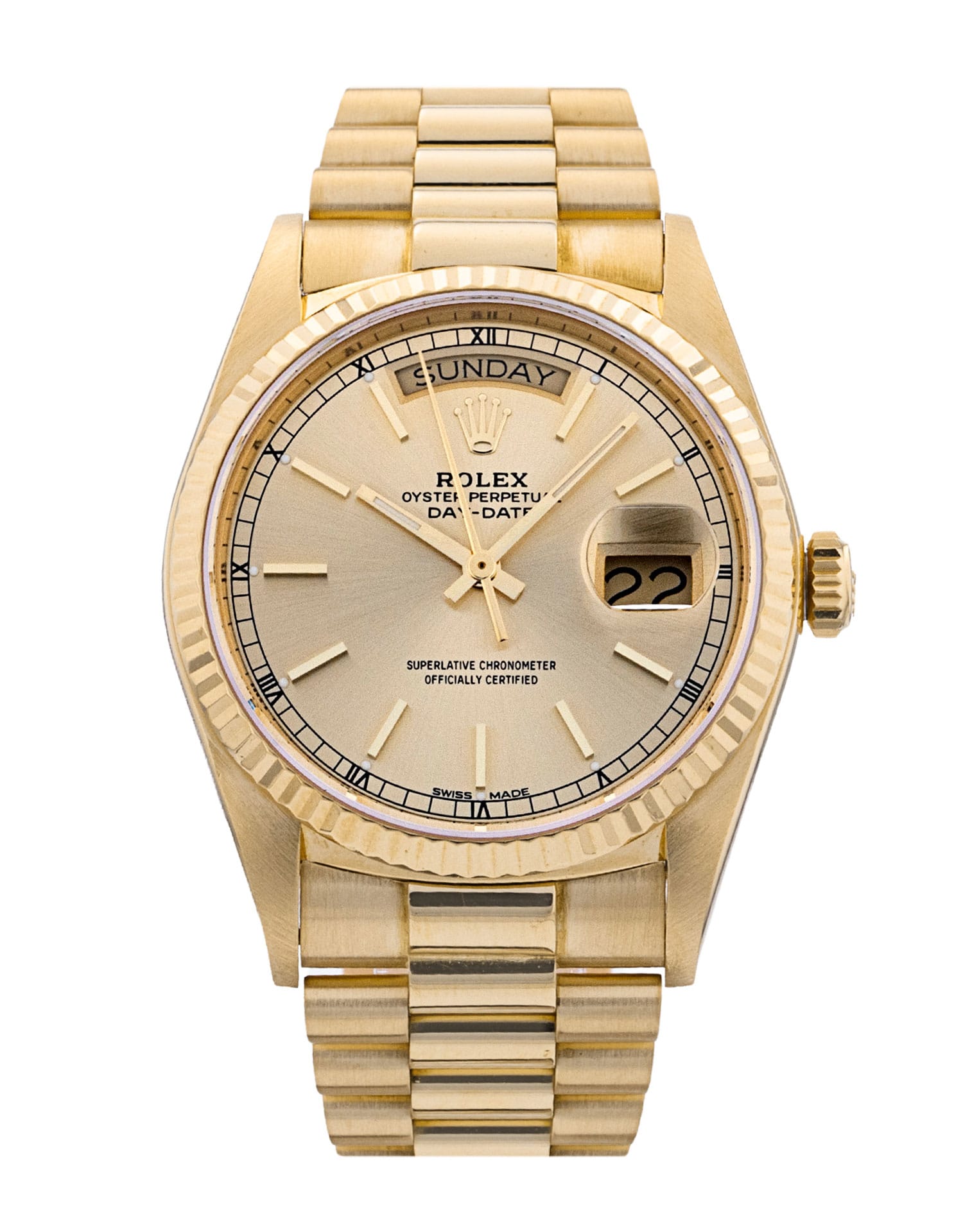 This Rolex Day-Date 18038 has a champagne baton dial and a bracelet strap. This Rolex has undergone a thorough inspection of water resistance, accuracy, functionality and condition to determine the level of reconditioning required to meet our strict standards. It has also been referenced against technical documents and manufacturer records where available to ensure authenticity and a clean history. Our watches have a 24-month warranty for your peace of mind, in conjunction with any remaining manufacturer’s warranty from new or from service. To maintain the manufacturer’s warranty on this watch, it has not been polished in our service centre.