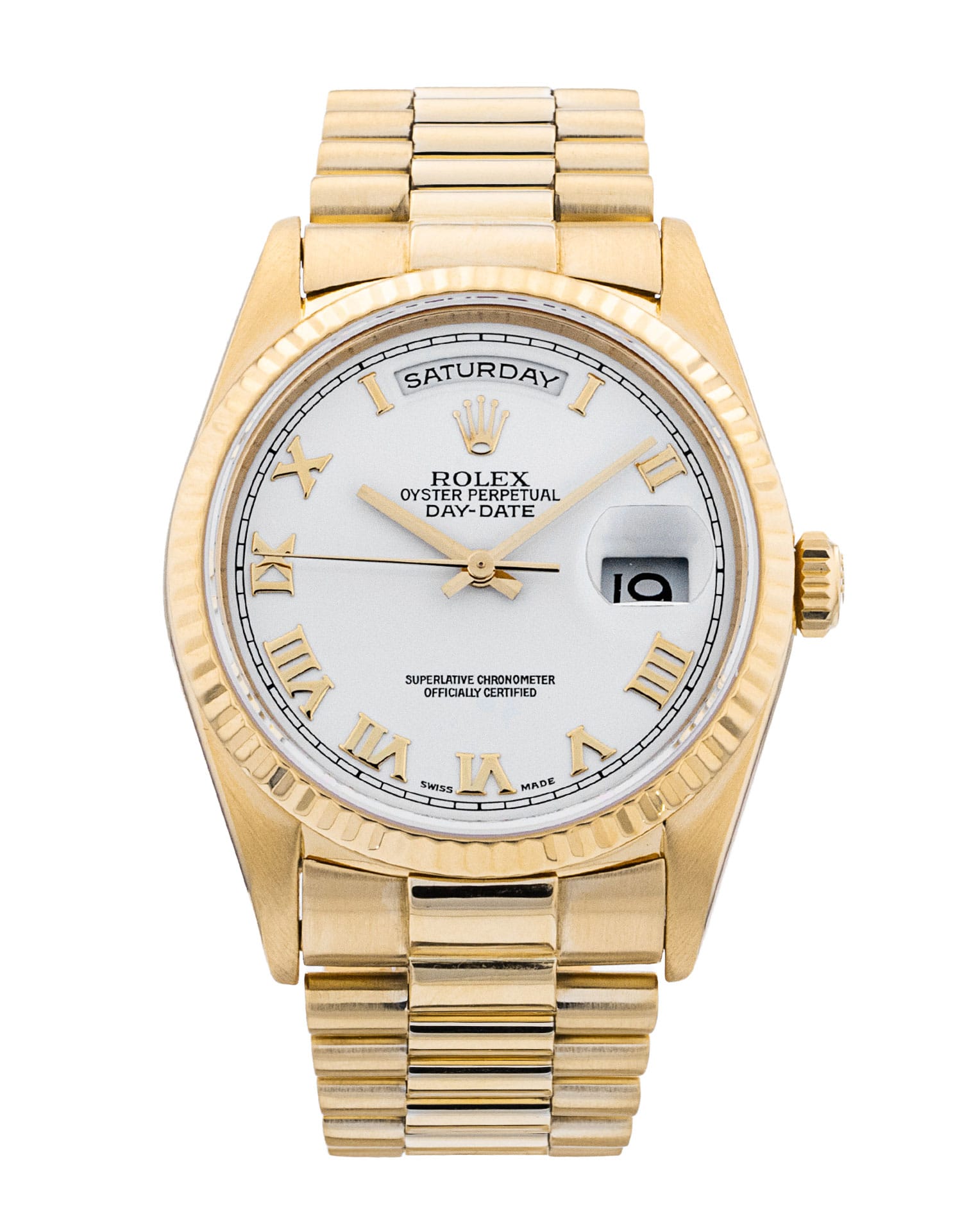 This Rolex Day-Date 18238 has a white roman numeral dial and a bracelet strap. This Rolex has undergone a thorough inspection of water resistance, accuracy, functionality and condition to determine the level of reconditioning required to meet our strict standards. It has also been referenced against technical documents and manufacturer records where available to ensure authenticity and a clean history. All our watches have a 24-month warranty for your peace of mind. One of our skilled polishing technicians has removed marks on the case and bracelet of this watch, brought about by daily wear and tear, which is why this watch does not come with the remaining manufacturer’s warranty.
