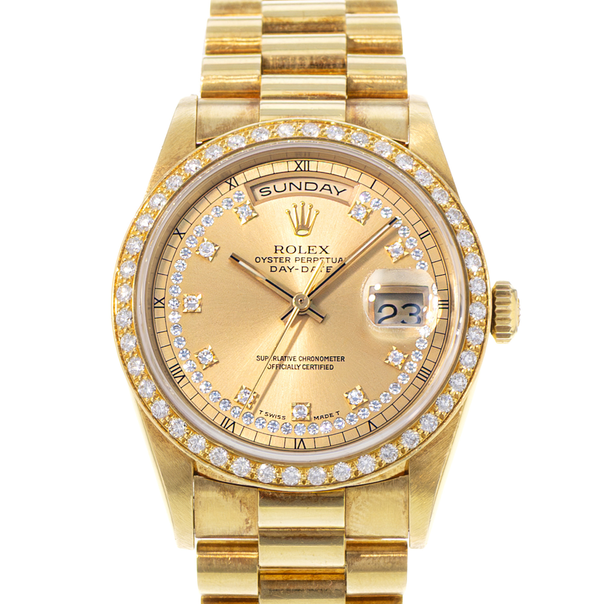This Rolex Day-Date 18348 has a champagne diamond dial and a bracelet strap. This Rolex has undergone a thorough inspection of water resistance, accuracy, functionality and condition to determine the level of reconditioning required to meet our strict standards. It has also been referenced against technical documents and manufacturer records where available to ensure authenticity and a clean history. All our watches have a 24-month warranty for your peace of mind. One of our skilled polishing technicians has removed marks on the case and bracelet of this watch, brought about by daily wear and tear, which is why this watch does not come with the remaining manufacturer’s warranty.