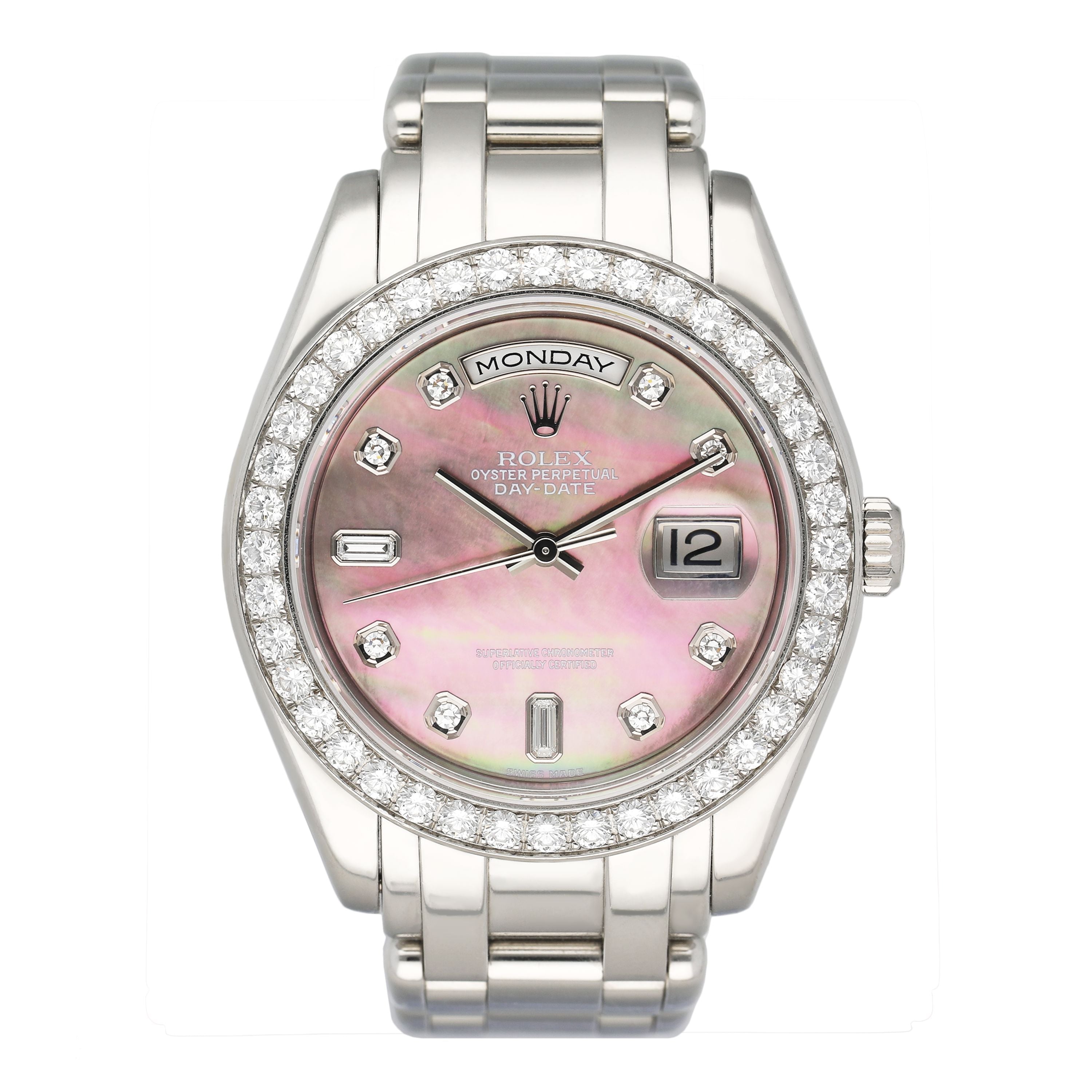 This Rolex Day-Date 18946 has a mother of pearl white - diamond dial and a bracelet strap. This Rolex has undergone a thorough inspection of water resistance, accuracy, functionality and condition to determine the level of reconditioning required to meet our strict standards. It has also been referenced against technical documents and manufacturer records where available to ensure authenticity and a clean history. All our watches have a 24-month warranty for your peace of mind. One of our skilled polishing technicians has removed marks on the case and bracelet of this watch, brought about by daily wear and tear, which is why this watch does not come with the remaining manufacturer’s warranty.