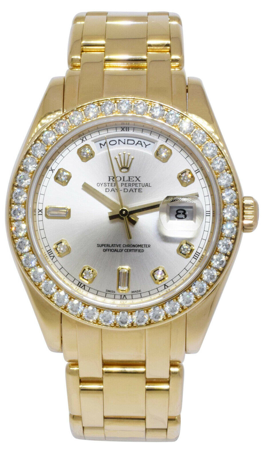 This Rolex Day-Date 18948 has a silver diamond dial and a bracelet strap. This Rolex has undergone a thorough inspection of water resistance, accuracy, functionality and condition to determine the level of reconditioning required to meet our strict standards. It has also been referenced against technical documents and manufacturer records where available to ensure authenticity and a clean history. All our watches have a 24-month warranty for your peace of mind. One of our skilled polishing technicians has removed marks on the case and bracelet of this watch, brought about by daily wear and tear, which is why this watch does not come with the remaining manufacturer’s warranty.