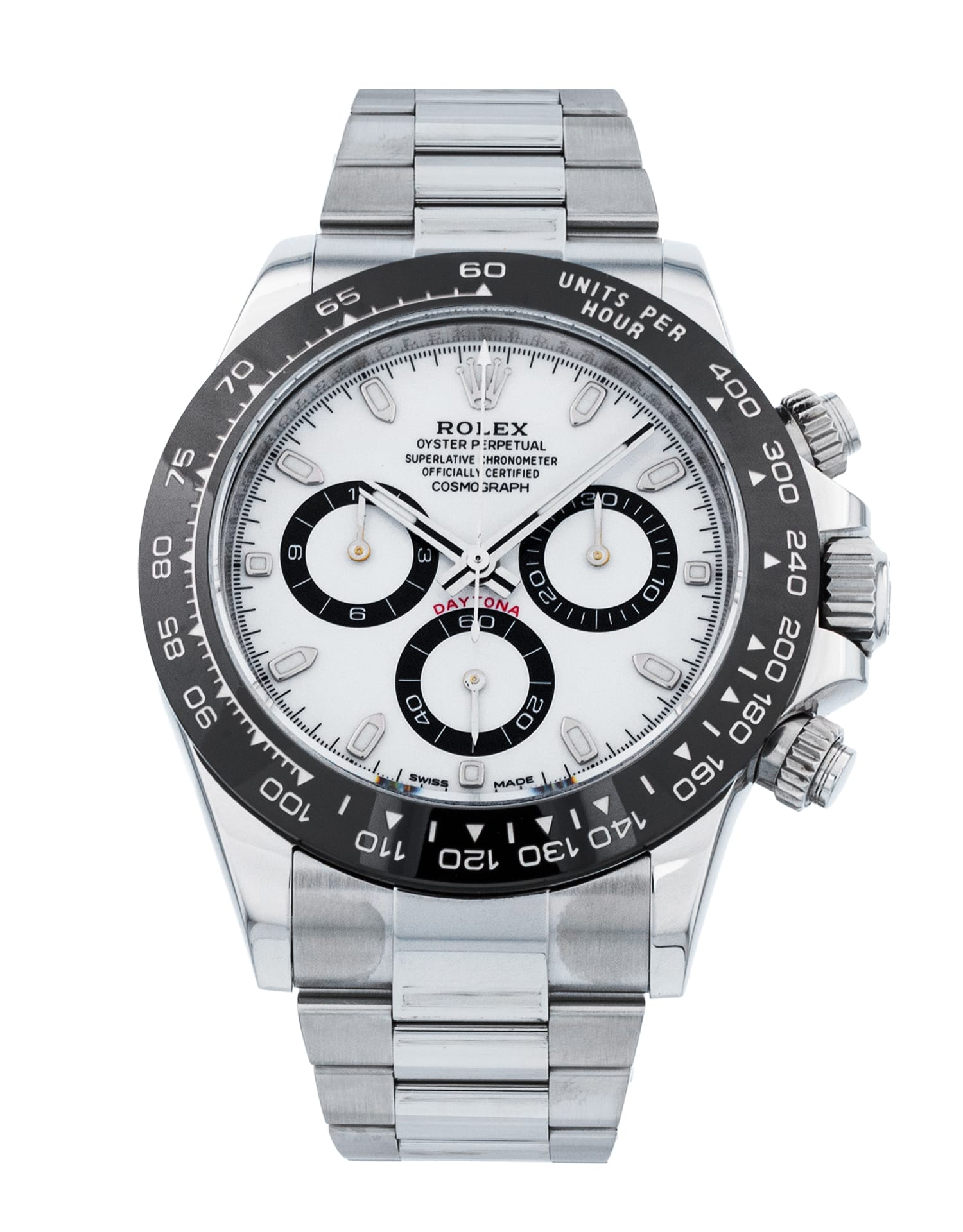 This Rolex Daytona 116500 LN has a white dial and a bracelet strap. This Rolex has undergone a thorough inspection of water resistance, accuracy, functionality and condition to determine the level of reconditioning required to meet our strict standards. It has also been referenced against technical documents and manufacturer records where available to ensure authenticity and a clean history. Our watches have a 24-month warranty for your peace of mind, in conjunction with any remaining manufacturer’s warranty from new or from service. To maintain the manufacturer’s warranty on this watch, it has not been polished in our service centre.
