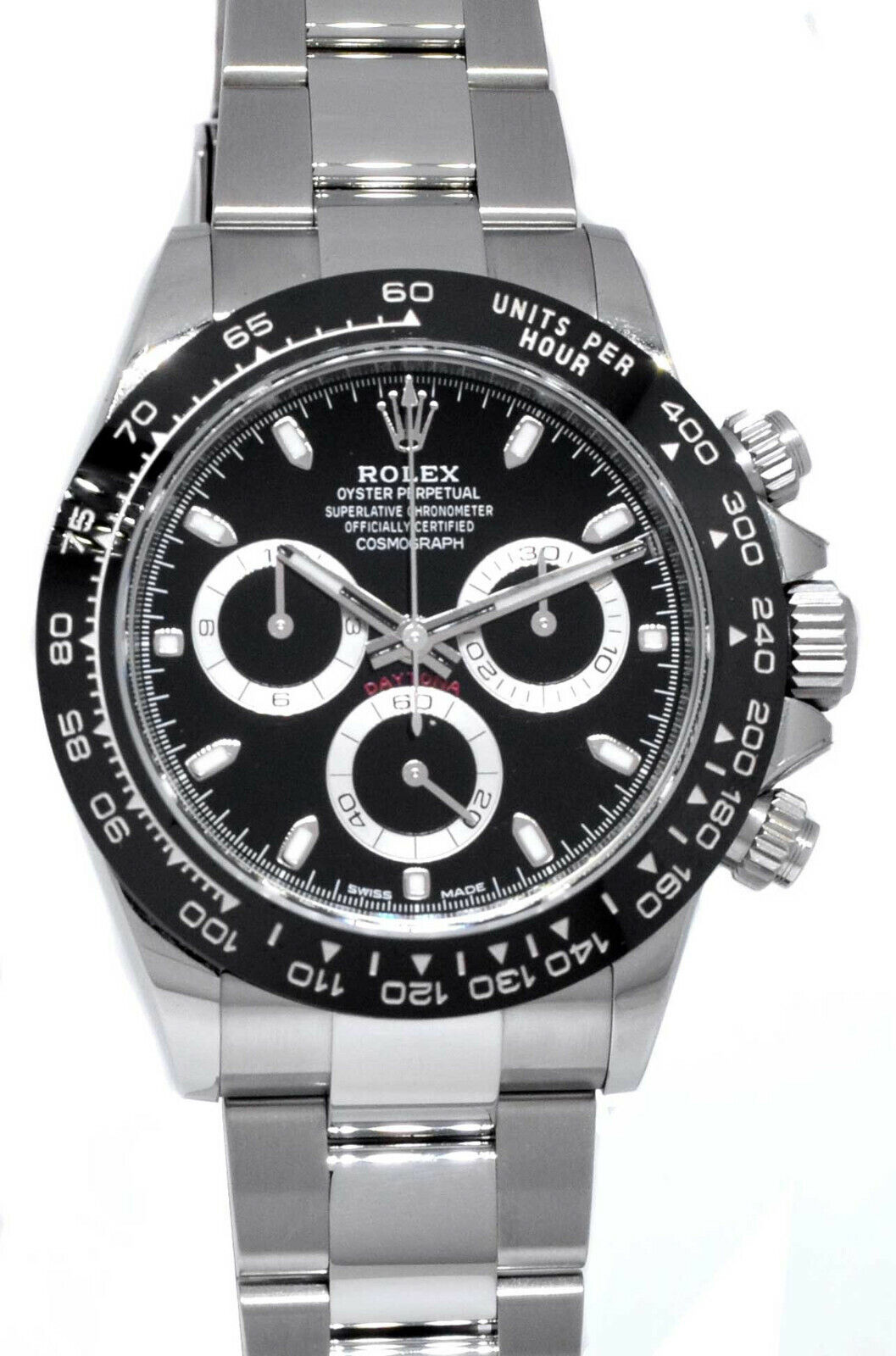 This Rolex Daytona 116500 LN has a black dial and a bracelet strap. This Rolex has undergone a thorough inspection of water resistance, accuracy, functionality and condition to determine the level of reconditioning required to meet our strict standards. It has also been referenced against technical documents and manufacturer records where available to ensure authenticity and a clean history. All our watches have a 24-month warranty for your peace of mind. One of our skilled polishing technicians has removed marks on the case and bracelet of this watch, brought about by daily wear and tear, which is why this watch does not come with the remaining manufacturer’s warranty.