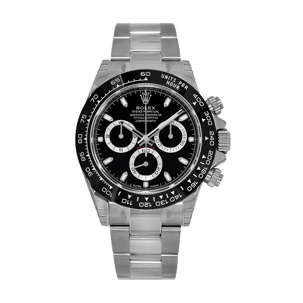 This Rolex Daytona 116500 LN has a black dial and a bracelet strap. This Rolex has undergone a thorough inspection of water resistance, accuracy, functionality and condition to determine the level of reconditioning required to meet our strict standards. It has also been referenced against technical documents and manufacturer records where available to ensure authenticity and a clean history. Our watches have a 24-month warranty for your peace of mind, in conjunction with any remaining manufacturer’s warranty from new or from service. To maintain the manufacturer’s warranty on this watch, it has not been polished in our service centre.