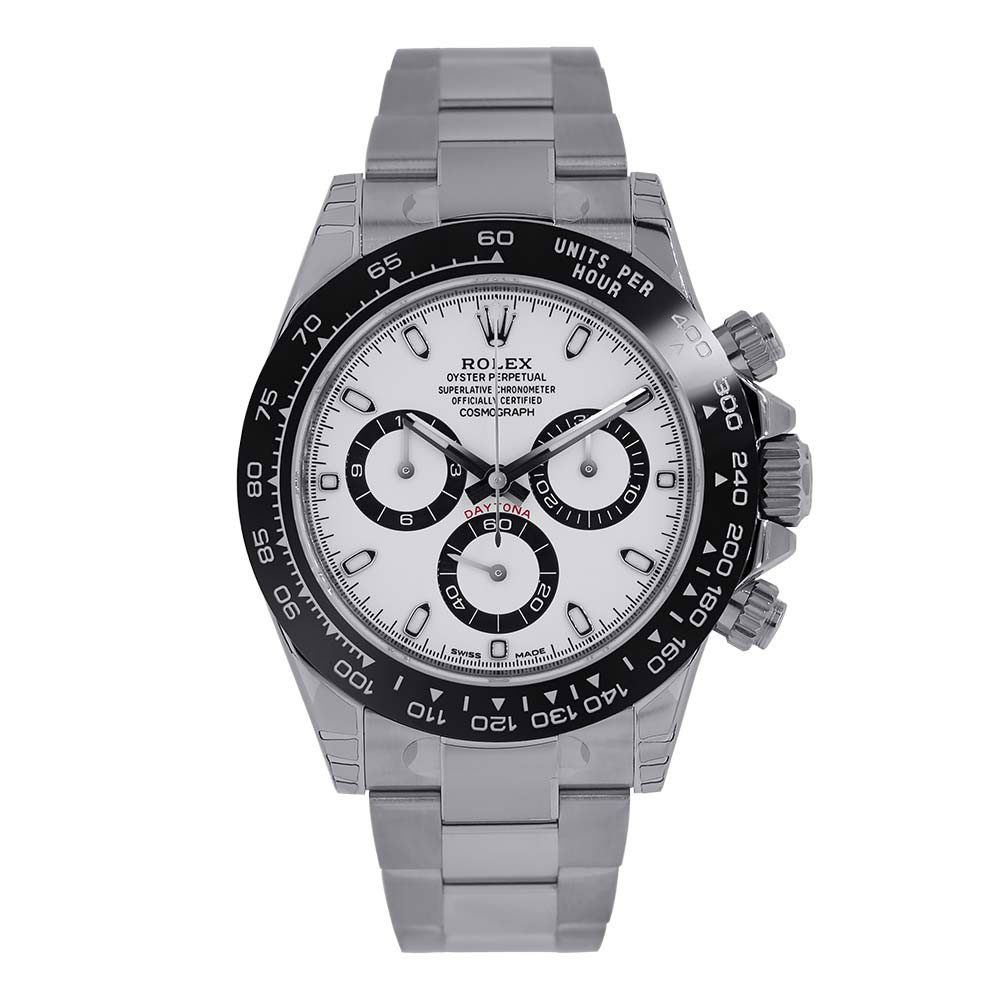 This Rolex Daytona 116500 LN has a white dial and a bracelet strap. This Rolex has undergone a thorough inspection of water resistance, accuracy, functionality and condition to determine the level of reconditioning required to meet our strict standards. It has also been referenced against technical documents and manufacturer records where available to ensure authenticity and a clean history. All our watches have a 24-month warranty for your peace of mind. One of our skilled polishing technicians has removed marks on the case and bracelet of this watch, brought about by daily wear and tear, which is why this watch does not come with the remaining manufacturer’s warranty.