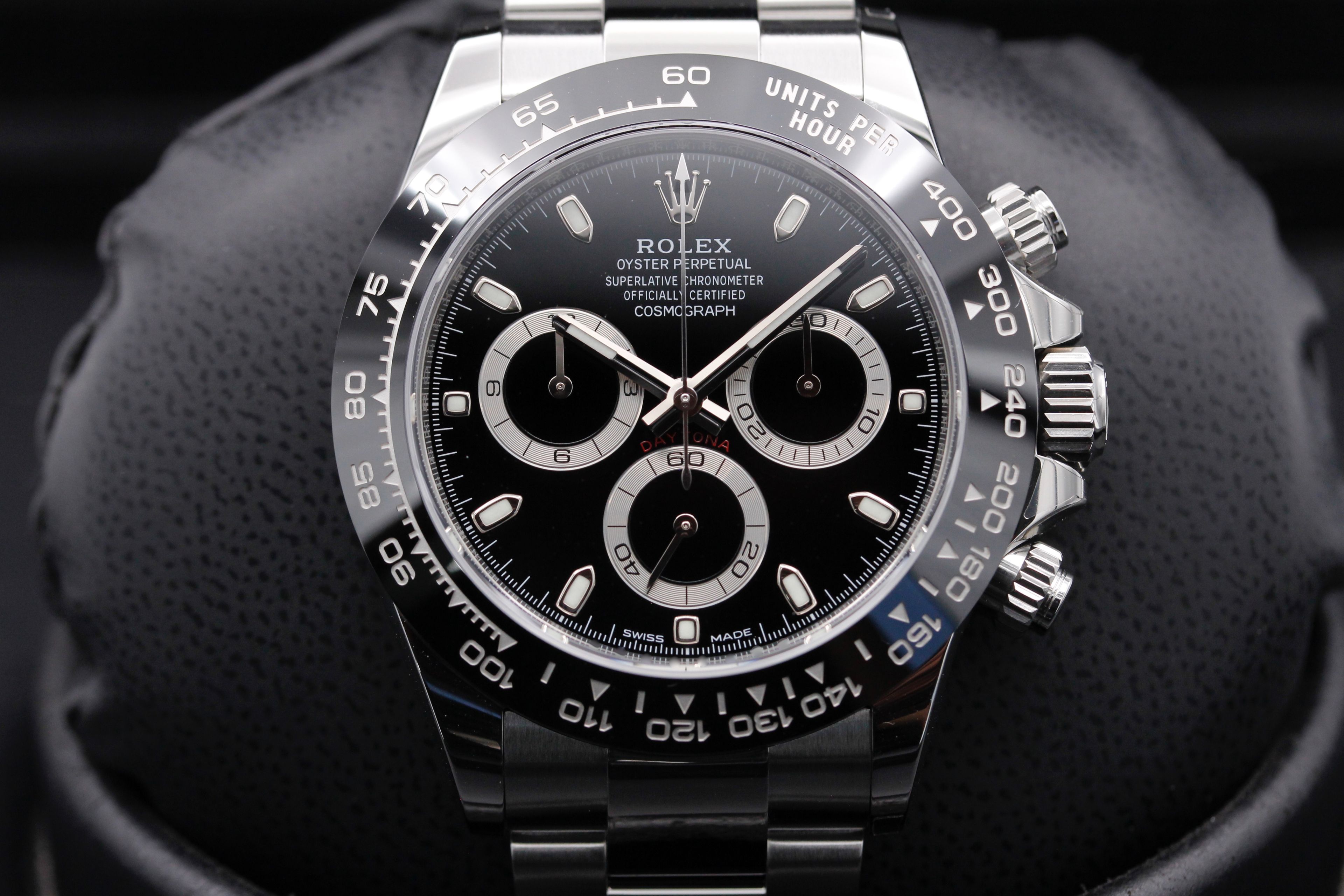 This Rolex Daytona 116500 LN has a black dial and a bracelet strap. This Rolex has undergone a thorough inspection of water resistance, accuracy, functionality and condition to determine the level of reconditioning required to meet our strict standards. It has also been referenced against technical documents and manufacturer records where available to ensure authenticity and a clean history. Our watches have a 24-month warranty for your peace of mind, in conjunction with any remaining manufacturer’s warranty from new or from service. To maintain the manufacturer’s warranty on this watch, it has not been polished in our service centre.