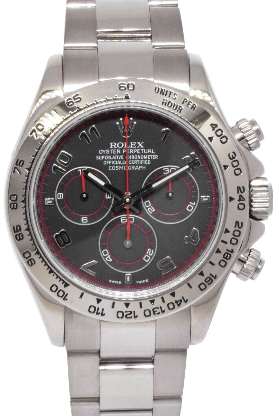 This Rolex Daytona 116509 has a black arabic dial and a bracelet strap. This Rolex has undergone a thorough inspection of water resistance, accuracy, functionality and condition to determine the level of reconditioning required to meet our strict standards. It has also been referenced against technical documents and manufacturer records where available to ensure authenticity and a clean history. All our watches have a 24-month warranty for your peace of mind. One of our skilled polishing technicians has removed marks on the case and bracelet of this watch, brought about by daily wear and tear, which is why this watch does not come with the remaining manufacturer’s warranty.