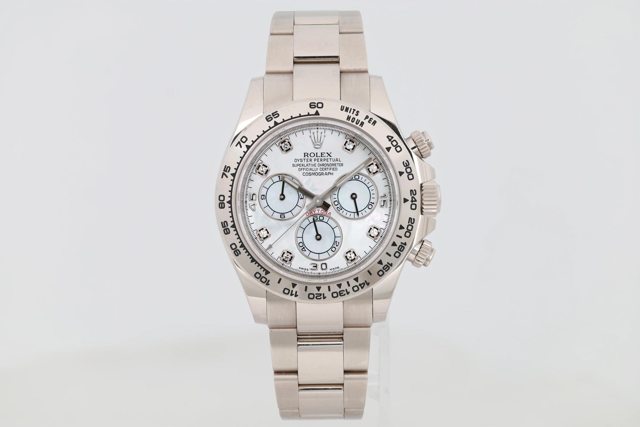 This Rolex Daytona 116509 has a mother of pearl white - diamond dial and a bracelet strap. This Rolex has undergone a thorough inspection of water resistance, accuracy, functionality and condition to determine the level of reconditioning required to meet our strict standards. It has also been referenced against technical documents and manufacturer records where available to ensure authenticity and a clean history. All our watches have a 24-month warranty for your peace of mind. One of our skilled polishing technicians has removed marks on the case and bracelet of this watch, brought about by daily wear and tear, which is why this watch does not come with the remaining manufacturer’s warranty.