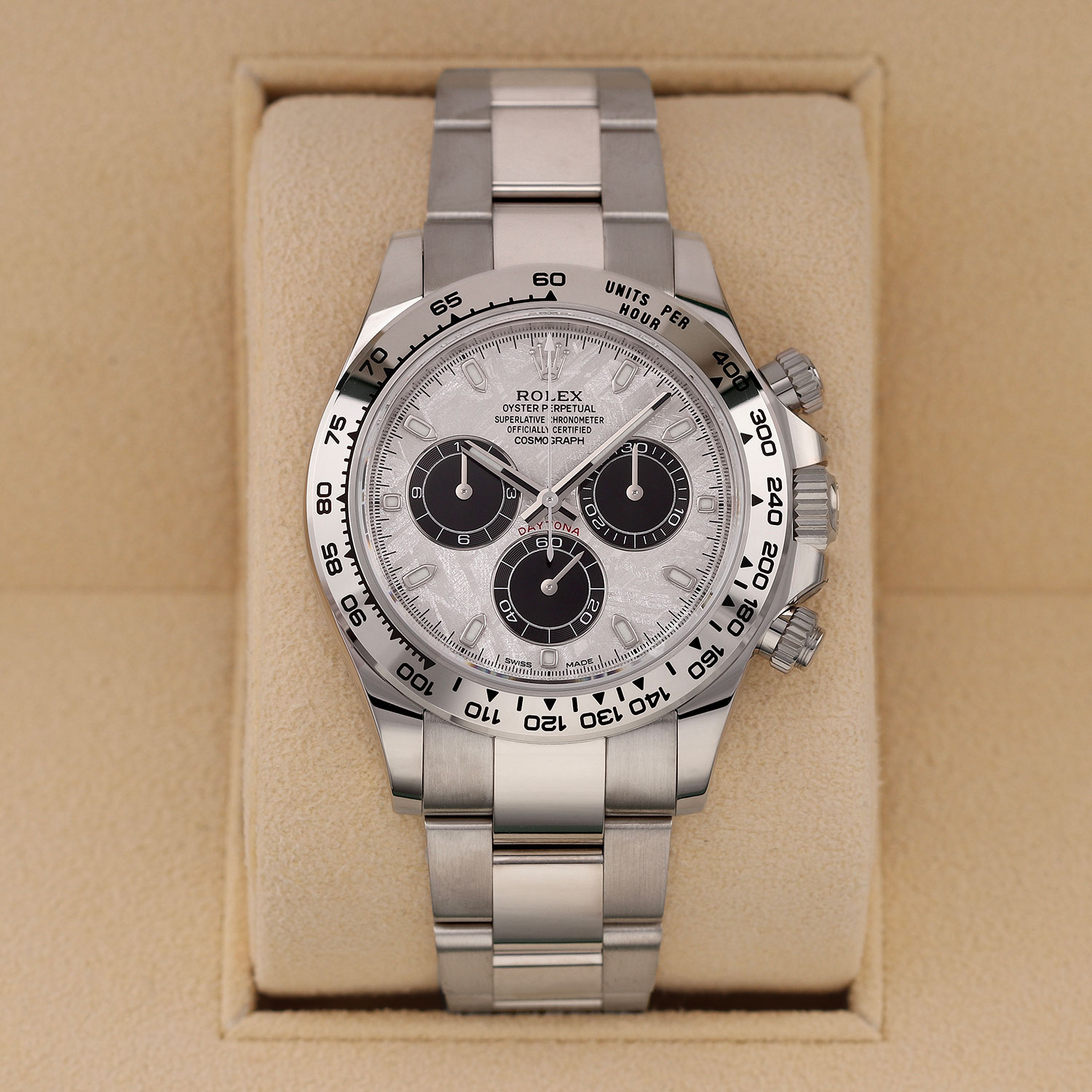 This Rolex Daytona 116509 has a meteorite dial and a bracelet strap. This Rolex has undergone a thorough inspection of water resistance, accuracy, functionality and condition to determine the level of reconditioning required to meet our strict standards. It has also been referenced against technical documents and manufacturer records where available to ensure authenticity and a clean history. Our watches have a 24-month warranty for your peace of mind, in conjunction with any remaining manufacturer’s warranty from new or from service. To maintain the manufacturer’s warranty on this watch, it has not been polished in our service centre.