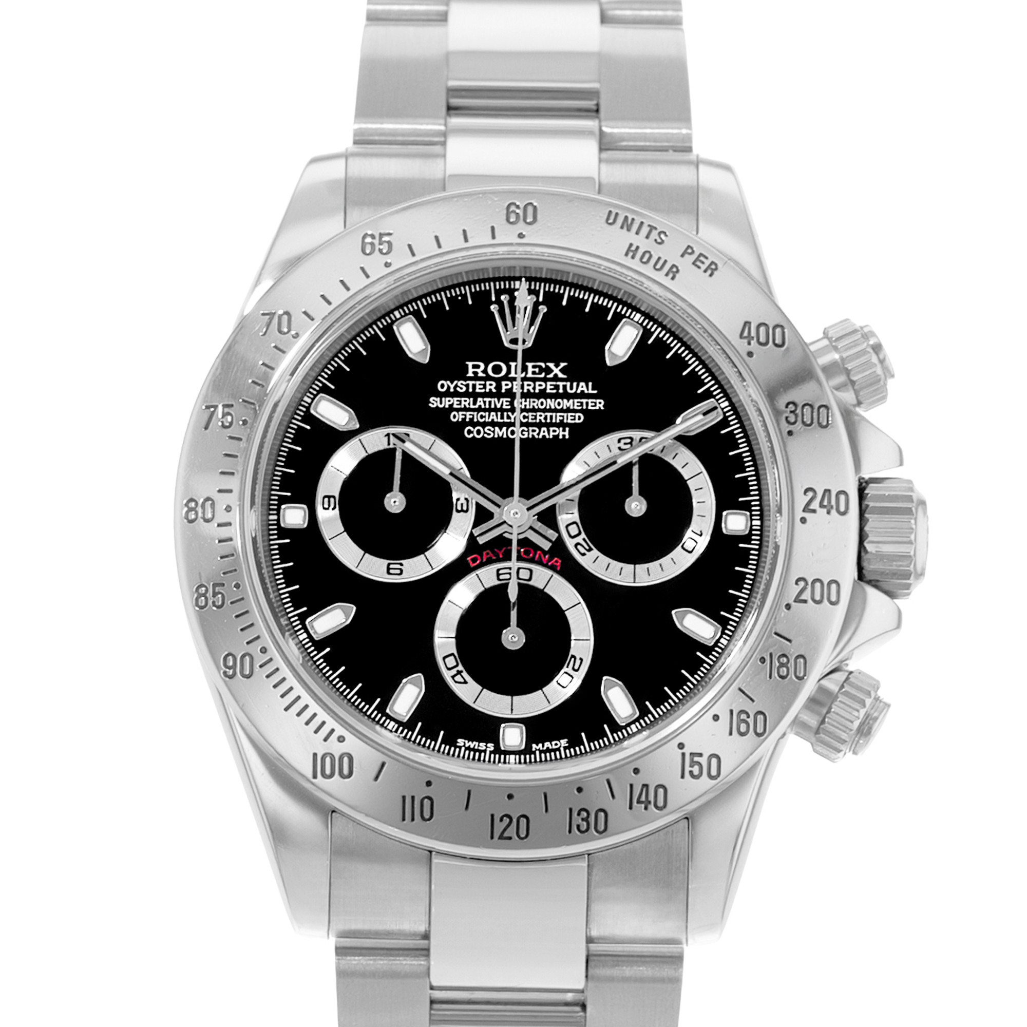 This Rolex Daytona 116520 has a black dial and a bracelet strap. This Rolex has undergone a thorough inspection of water resistance, accuracy, functionality and condition to determine the level of reconditioning required to meet our strict standards. It has also been referenced against technical documents and manufacturer records where available to ensure authenticity and a clean history. All our watches have a 24-month warranty for your peace of mind. One of our skilled polishing technicians has removed marks on the case and bracelet of this watch, brought about by daily wear and tear, which is why this watch does not come with the remaining manufacturer’s warranty.