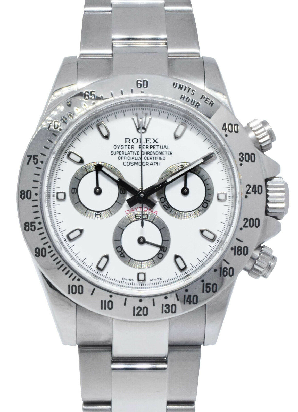 This Rolex Daytona 116520 has a white dial and a bracelet strap. This Rolex has undergone a thorough inspection of water resistance, accuracy, functionality and condition to determine the level of reconditioning required to meet our strict standards. It has also been referenced against technical documents and manufacturer records where available to ensure authenticity and a clean history. All our watches have a 24-month warranty for your peace of mind. One of our skilled polishing technicians has removed marks on the case and bracelet of this watch, brought about by daily wear and tear, which is why this watch does not come with the remaining manufacturer’s warranty.