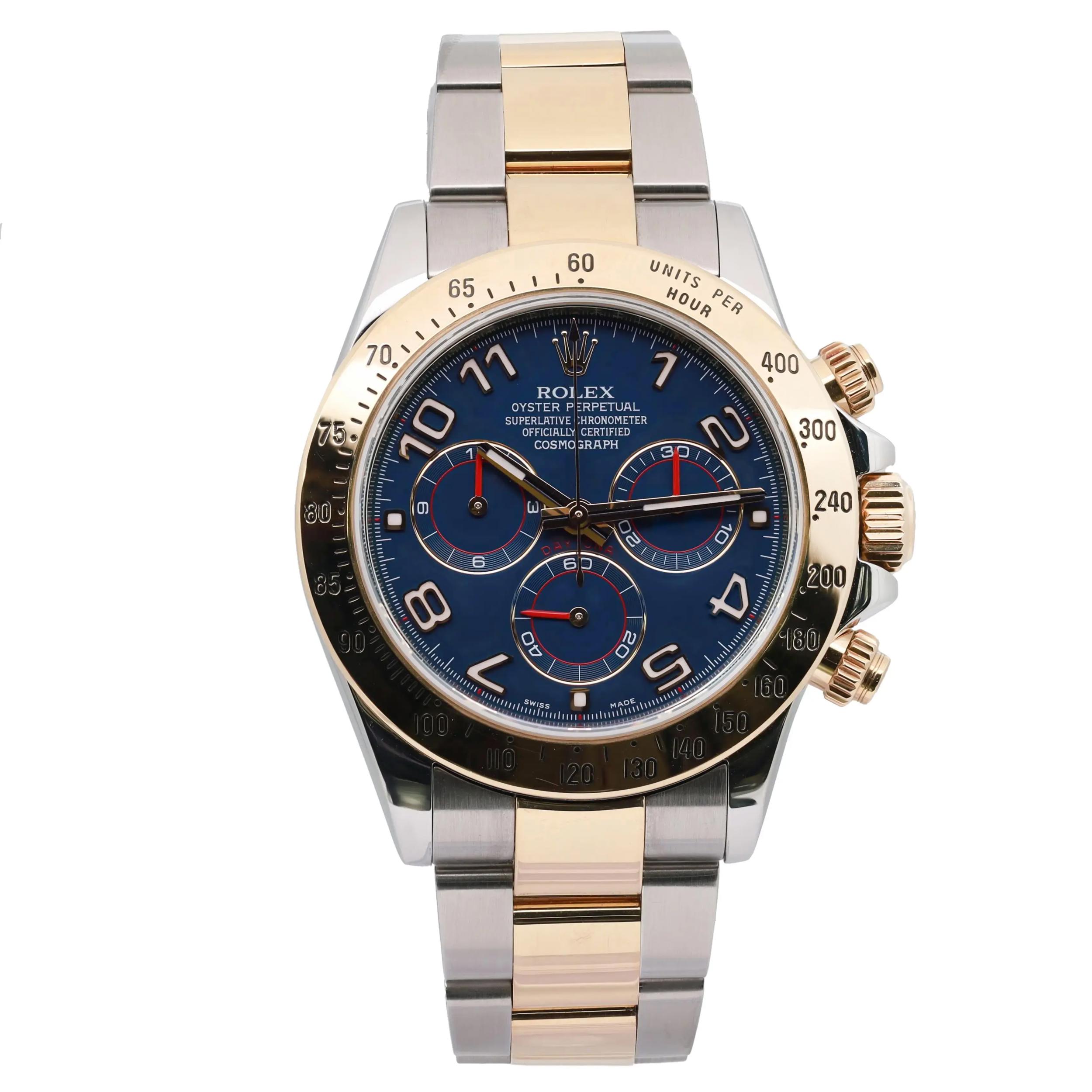 This Rolex Daytona 116523 has a blue arabic dial and a bracelet strap. This Rolex has undergone a thorough inspection of water resistance, accuracy, functionality and condition to determine the level of reconditioning required to meet our strict standards. It has also been referenced against technical documents and manufacturer records where available to ensure authenticity and a clean history. All our watches have a 24-month warranty for your peace of mind. One of our skilled polishing technicians has removed marks on the case and bracelet of this watch, brought about by daily wear and tear, which is why this watch does not come with the remaining manufacturer’s warranty.