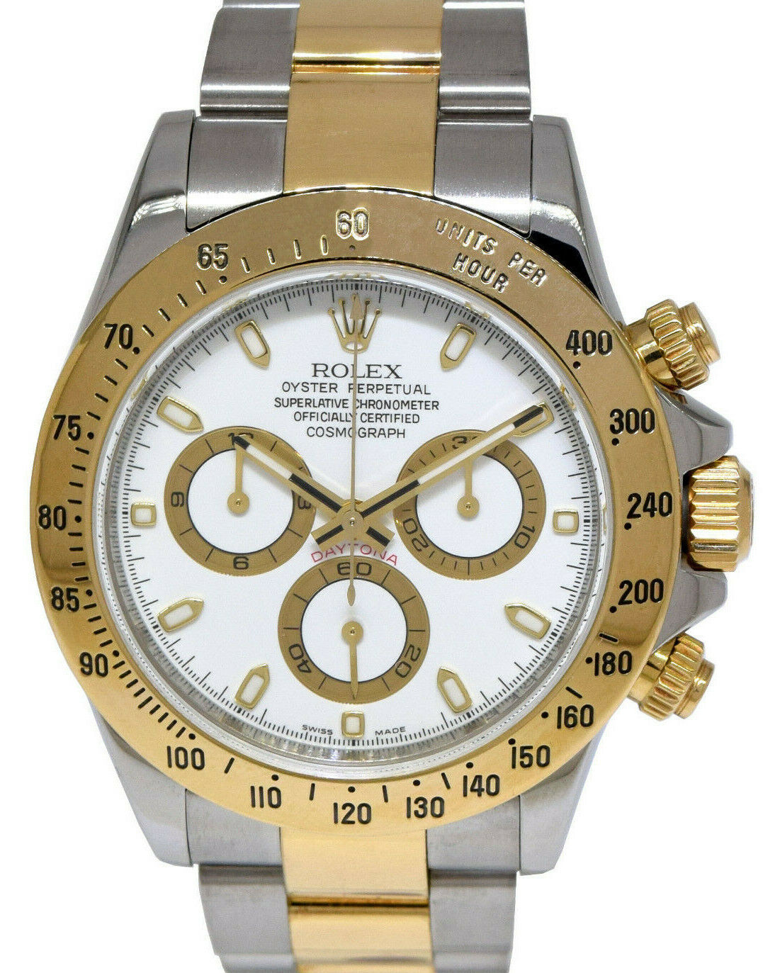 This Rolex Daytona 116523 has a white baton dial and a bracelet strap. This Rolex has undergone a thorough inspection of water resistance, accuracy, functionality and condition to determine the level of reconditioning required to meet our strict standards. It has also been referenced against technical documents and manufacturer records where available to ensure authenticity and a clean history. All our watches have a 24-month warranty for your peace of mind. One of our skilled polishing technicians has removed marks on the case and bracelet of this watch, brought about by daily wear and tear, which is why this watch does not come with the remaining manufacturer’s warranty.