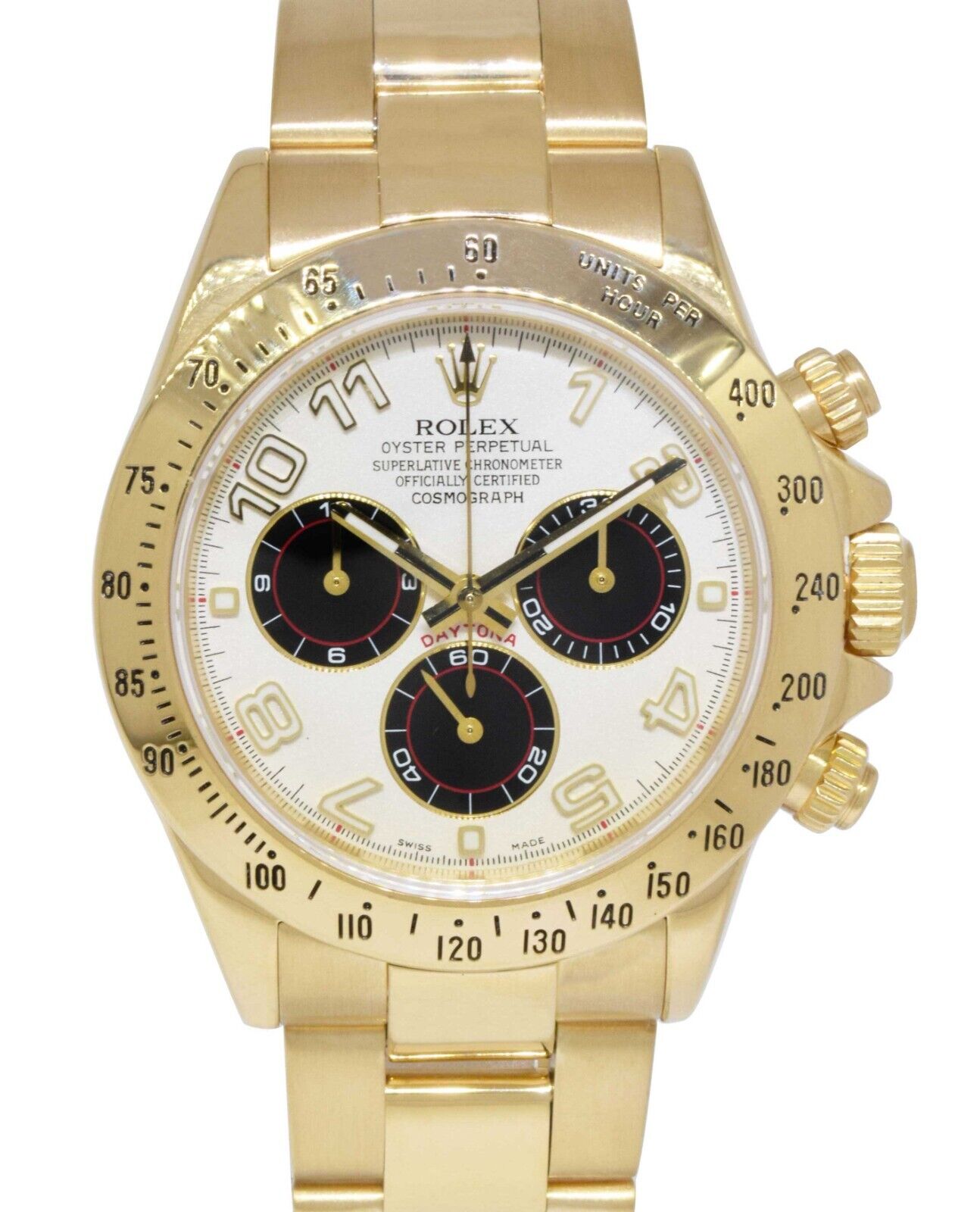 This Rolex Daytona 116528 has a white arabic dial and a bracelet strap. This Rolex has undergone a thorough inspection of water resistance, accuracy, functionality and condition to determine the level of reconditioning required to meet our strict standards. It has also been referenced against technical documents and manufacturer records where available to ensure authenticity and a clean history. All our watches have a 24-month warranty for your peace of mind. One of our skilled polishing technicians has removed marks on the case and bracelet of this watch, brought about by daily wear and tear, which is why this watch does not come with the remaining manufacturer’s warranty.