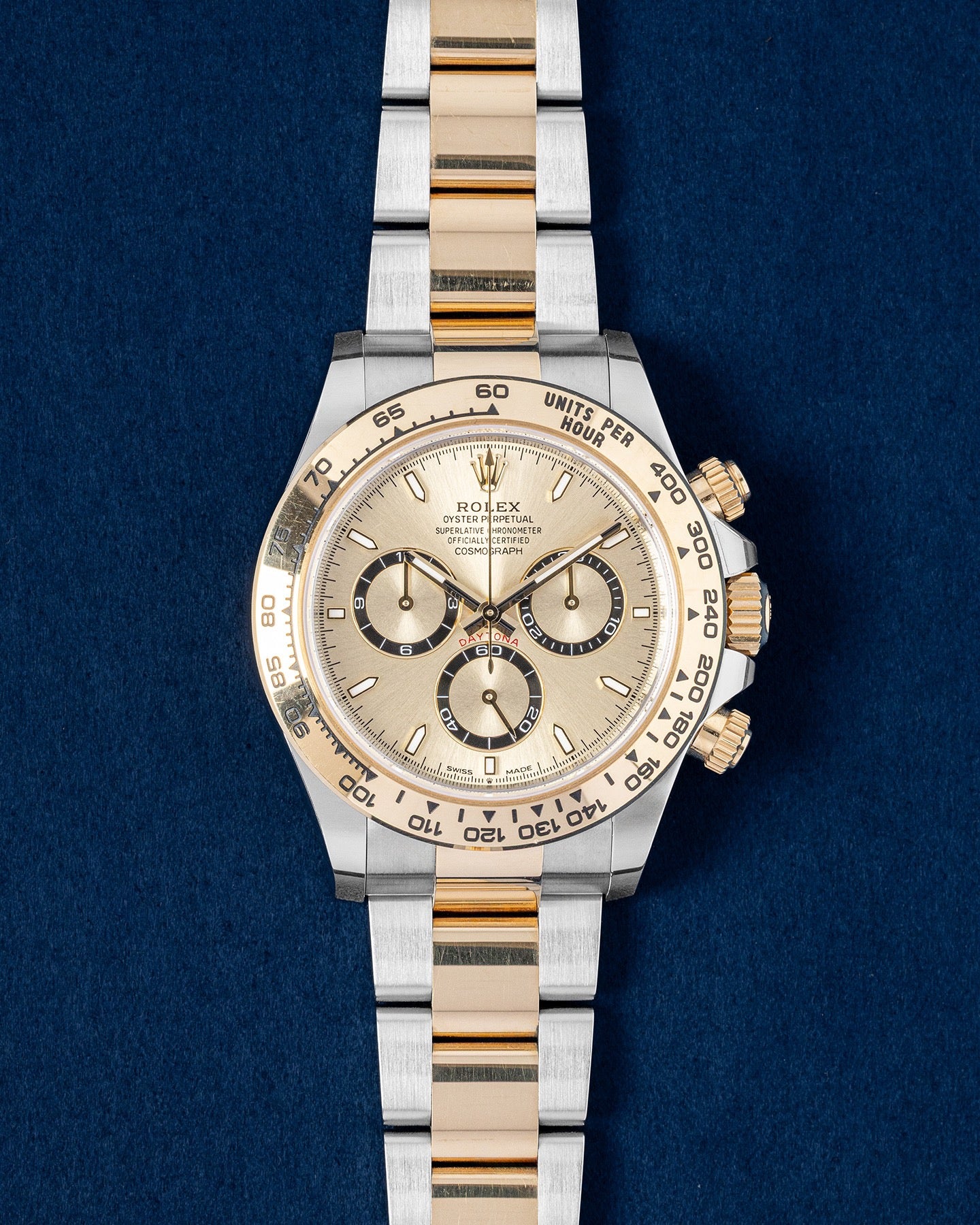 This Rolex Daytona 126503 has a champagne dial and a bracelet strap. This Rolex has undergone a thorough inspection of water resistance, accuracy, functionality and condition to determine the level of reconditioning required to meet our strict standards. It has also been referenced against technical documents and manufacturer records where available to ensure authenticity and a clean history. Our watches have a 24-month warranty for your peace of mind, in conjunction with any remaining manufacturer’s warranty from new or from service. To maintain the manufacturer’s warranty on this watch, it has not been polished in our service centre.