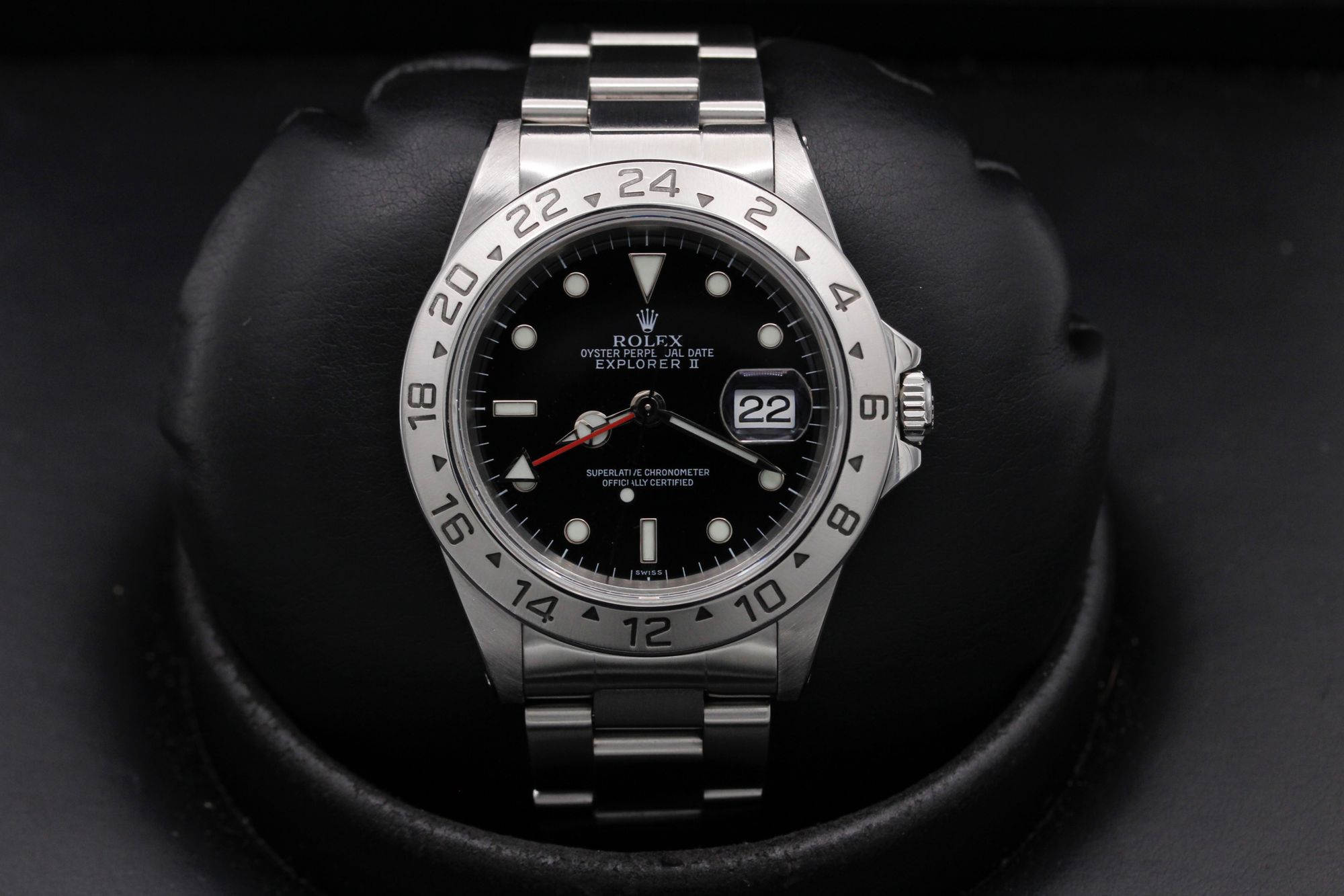 This Rolex Explorer II 16570 has a black dial and a bracelet strap. This Rolex has undergone a thorough inspection of water resistance, accuracy, functionality and condition to determine the level of reconditioning required to meet our strict standards. It has also been referenced against technical documents and manufacturer records where available to ensure authenticity and a clean history. All our watches have a 24-month warranty for your peace of mind. One of our skilled polishing technicians has removed marks on the case and bracelet of this watch, brought about by daily wear and tear, which is why this watch does not come with the remaining manufacturer’s warranty.