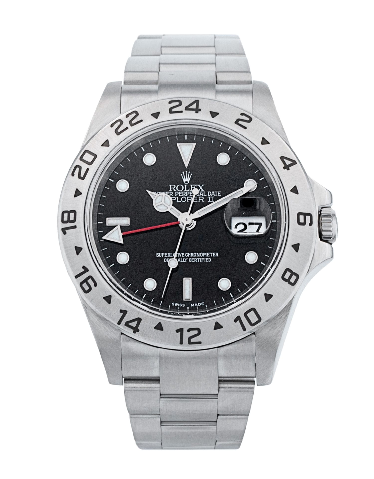 This Rolex Explorer II 16570 has a black dial and a bracelet strap. This Rolex has undergone a thorough inspection of water resistance, accuracy, functionality and condition to determine the level of reconditioning required to meet our strict standards. It has also been referenced against technical documents and manufacturer records where available to ensure authenticity and a clean history. All our watches have a 24-month warranty for your peace of mind. One of our skilled polishing technicians has removed marks on the case and bracelet of this watch, brought about by daily wear and tear, which is why this watch does not come with the remaining manufacturer’s warranty.