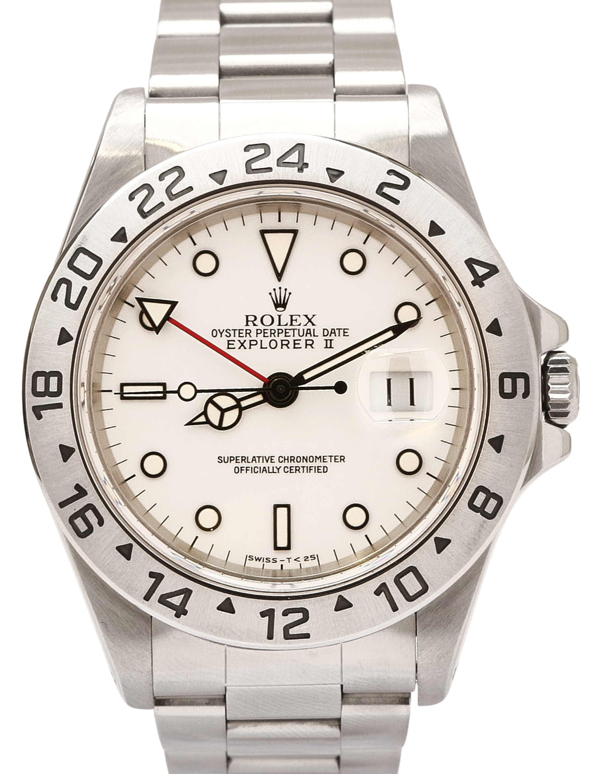 This Rolex Explorer II 16570 has a white dial and a bracelet strap. This Rolex has undergone a thorough inspection of water resistance, accuracy, functionality and condition to determine the level of reconditioning required to meet our strict standards. It has also been referenced against technical documents and manufacturer records where available to ensure authenticity and a clean history. All our watches have a 24-month warranty for your peace of mind. One of our skilled polishing technicians has removed marks on the case and bracelet of this watch, brought about by daily wear and tear, which is why this watch does not come with the remaining manufacturer’s warranty.