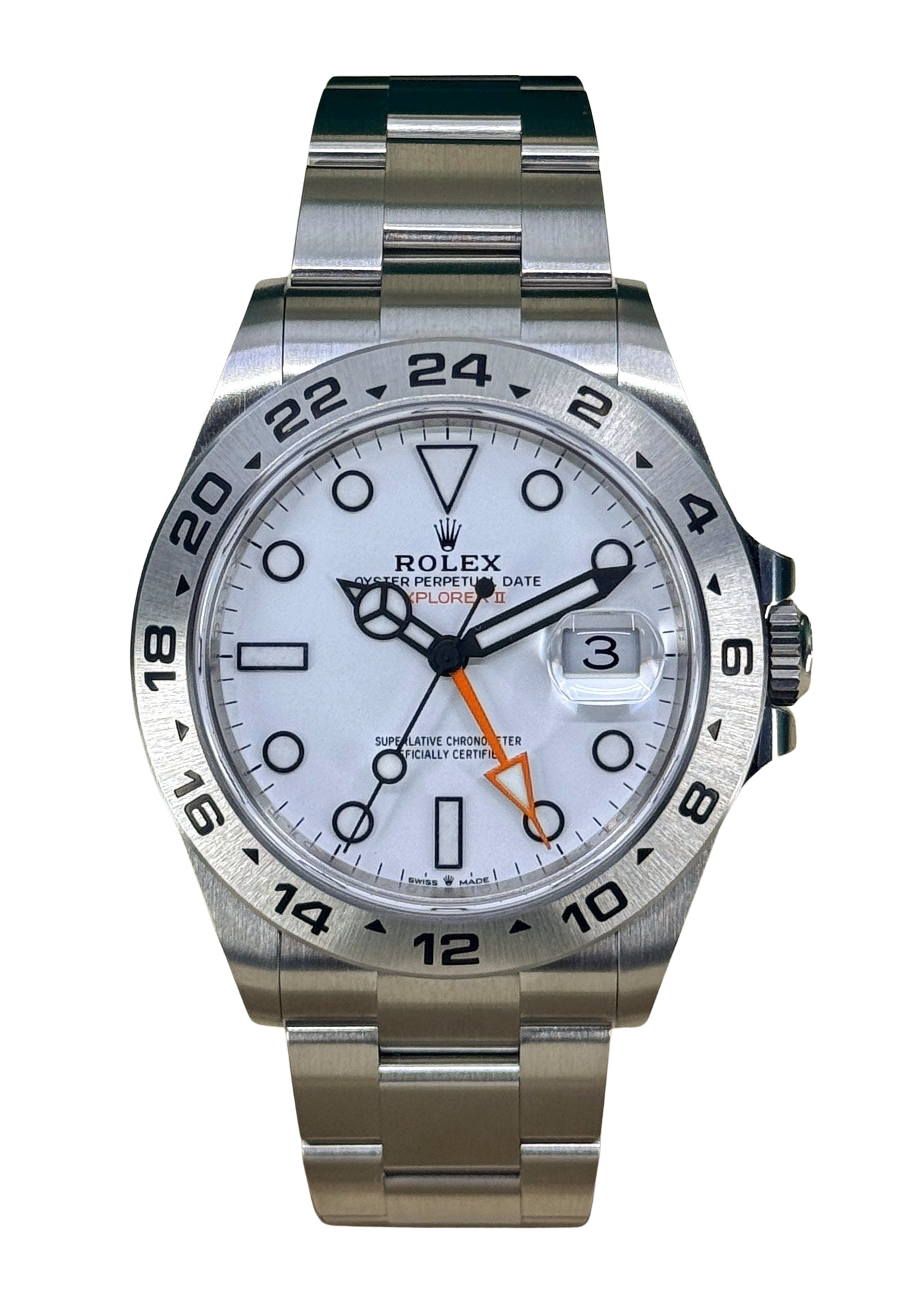 This Rolex Explorer II 226570 has a white dial and a bracelet strap. This Rolex has undergone a thorough inspection of water resistance, accuracy, functionality and condition to determine the level of reconditioning required to meet our strict standards. It has also been referenced against technical documents and manufacturer records where available to ensure authenticity and a clean history. Our watches have a 24-month warranty for your peace of mind, in conjunction with any remaining manufacturer’s warranty from new or from service. To maintain the manufacturer’s warranty on this watch, it has not been polished in our service centre.