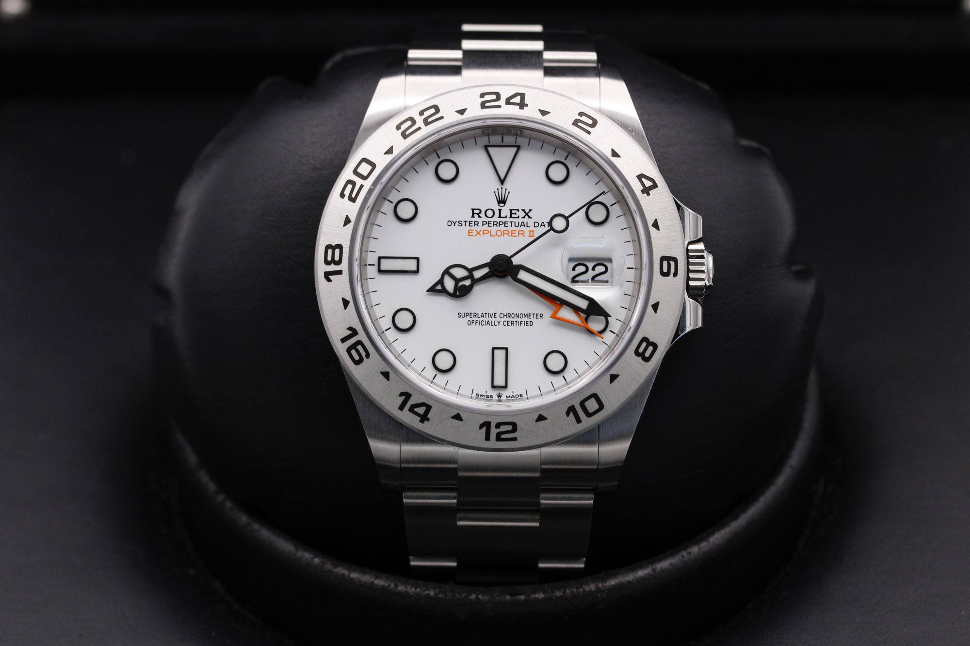 This Rolex Explorer II 226570 has a white dial and a bracelet strap. This Rolex has undergone a thorough inspection of water resistance, accuracy, functionality and condition to determine the level of reconditioning required to meet our strict standards. It has also been referenced against technical documents and manufacturer records where available to ensure authenticity and a clean history. Our watches have a 24-month warranty for your peace of mind, in conjunction with any remaining manufacturer’s warranty from new or from service. To maintain the manufacturer’s warranty on this watch, it has not been polished in our service centre.