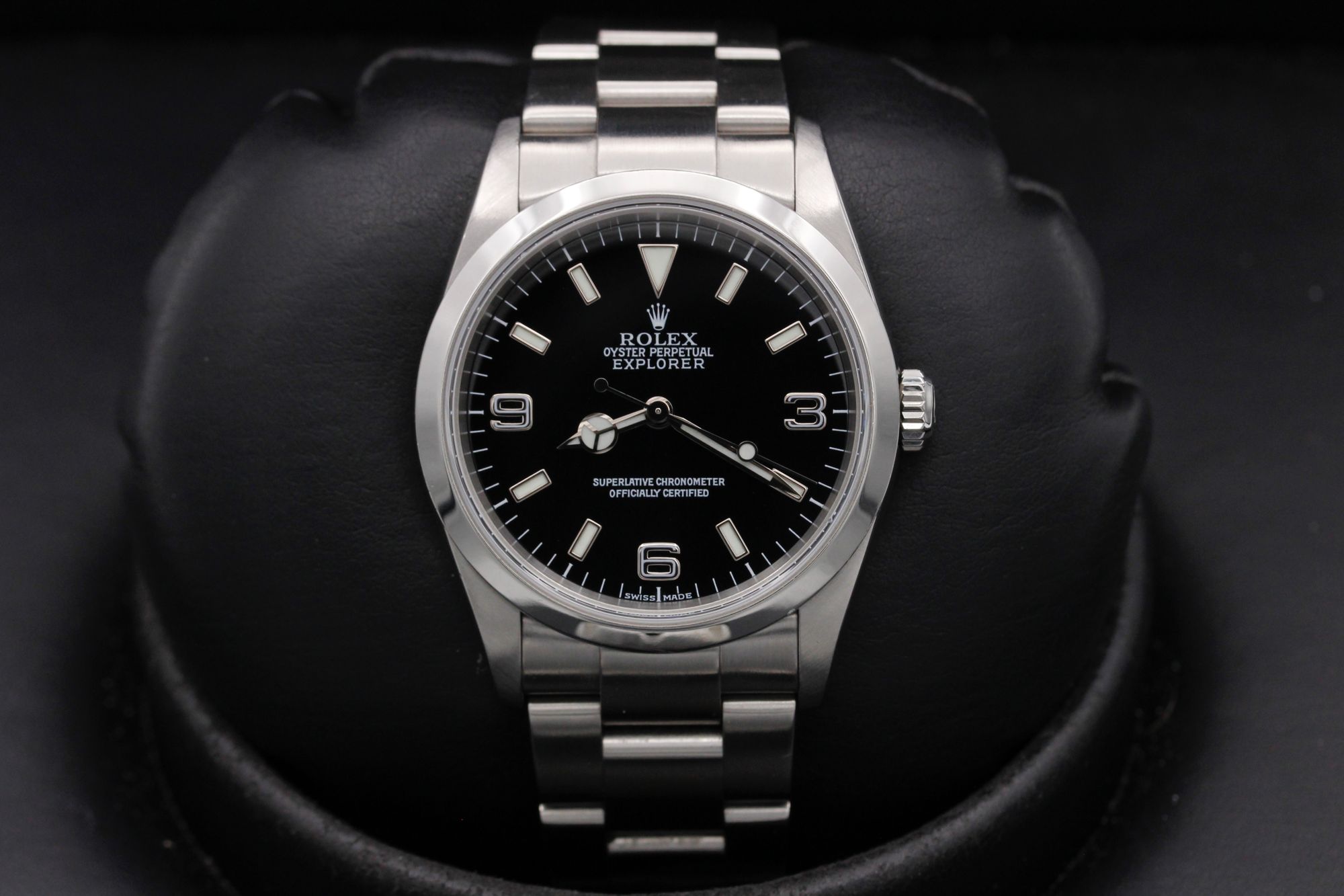 This Rolex Explorer 114270 has a black quarter arabic dial and a bracelet strap. This Rolex has undergone a thorough inspection of water resistance, accuracy, functionality and condition to determine the level of reconditioning required to meet our strict standards. It has also been referenced against technical documents and manufacturer records where available to ensure authenticity and a clean history. All our watches have a 24-month warranty for your peace of mind. One of our skilled polishing technicians has removed marks on the case and bracelet of this watch, brought about by daily wear and tear, which is why this watch does not come with the remaining manufacturer’s warranty.