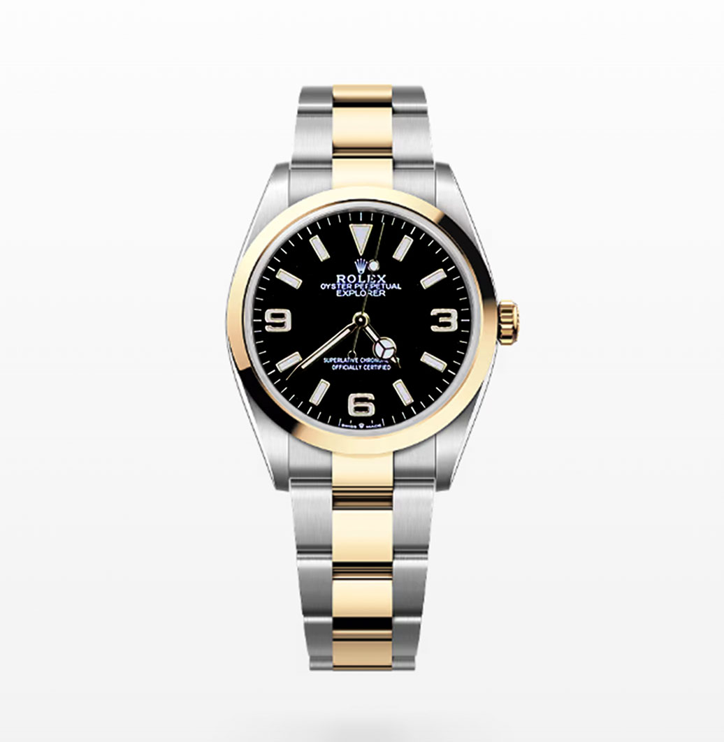 When Edmund Hillary and Tenzing Norgay became the first people to reach the summit of Everest in 1953, their expedition team were supplied with watches by Rolex and the British company Smith’s. Rolex designed a watch specifically for the expedition, which came to be known as the Explorer, one of the less prominent models in the Rolex stable but one that has been a constant since its launch. A far plainer looking watch back then, the Explorer aesthetic is now characterised by the Mercedes hour hand, three-quarter numeral black dial and Oyster bracelet. This model, with a 36mm case, is the first to come in two-tone steel and yellow gold and runs on a Caliber 3230 which holds a power reserve of almost 70 hours.