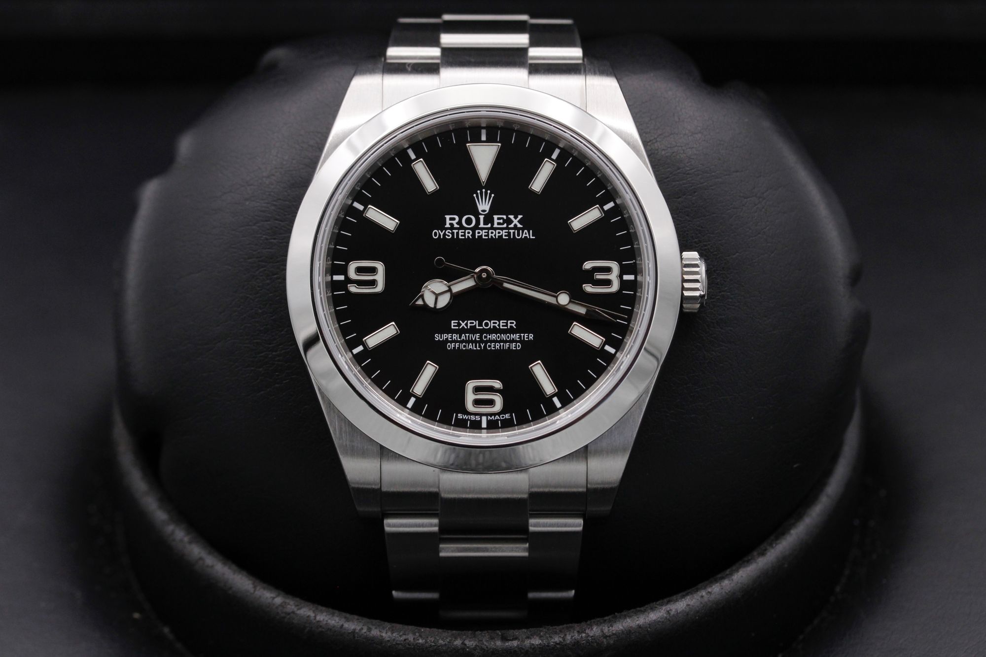 This Rolex Explorer 214270 has a black quarter arabic dial and a bracelet strap. This Rolex has undergone a thorough inspection of water resistance, accuracy, functionality and condition to determine the level of reconditioning required to meet our strict standards. It has also been referenced against technical documents and manufacturer records where available to ensure authenticity and a clean history. All our watches have a 24-month warranty for your peace of mind. One of our skilled polishing technicians has removed marks on the case and bracelet of this watch, brought about by daily wear and tear, which is why this watch does not come with the remaining manufacturer’s warranty.