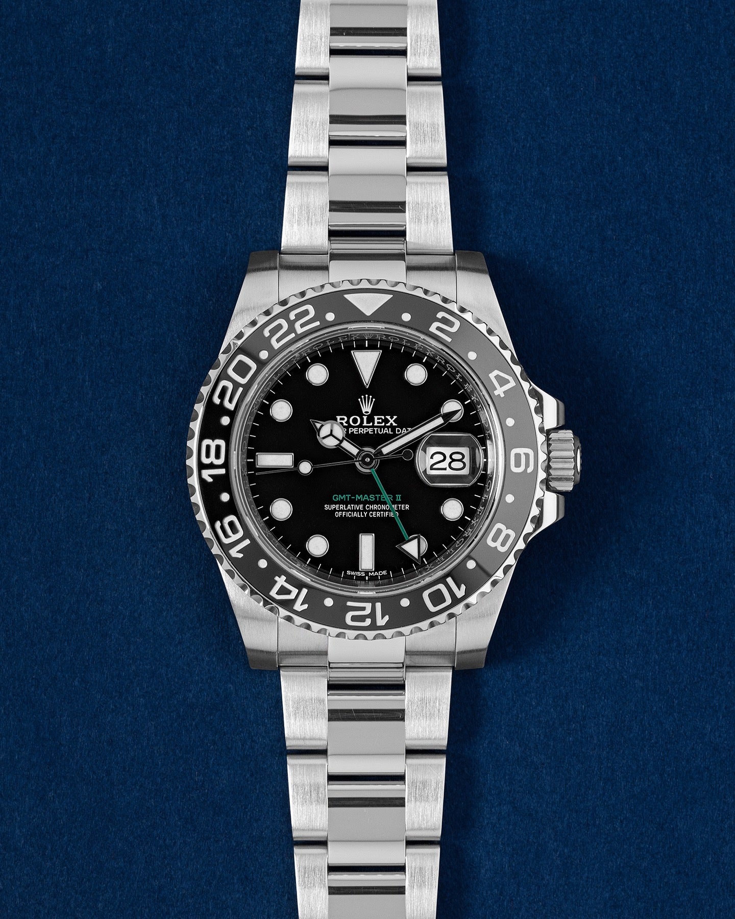 The GMT Master was first commissioned in the 1950s by pioneering airline Pan Am, and was designed for aviation. An increase in flight distances created demand for a watch that was able to tell the time in two different parts of the world simultaneously, so Rolex built it with an additional hand that could be set to a second time zone. By the 1980s, the watch had developed into the GMT Master II and was already a favourite among collectors. This model represents a significant upgrade for the watch, boasting an aerospace-grade “superalloy” steel case and cerachrom inserts in the bezel. The LN moniker stands for Lunette Noir—signifying that it uses an all-black bezel.