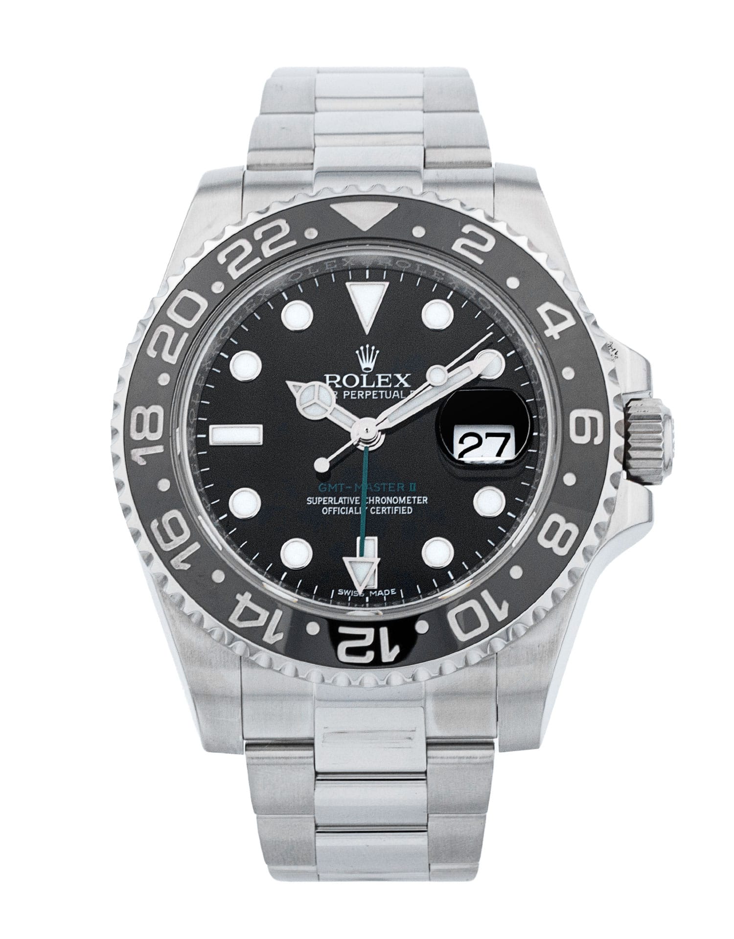 This Rolex GMT Master II 116710 LN has a black dial and a bracelet strap. This Rolex has undergone a thorough inspection of water resistance, accuracy, functionality and condition to determine the level of reconditioning required to meet our strict standards. It has also been referenced against technical documents and manufacturer records where available to ensure authenticity and a clean history. All our watches have a 24-month warranty for your peace of mind. One of our skilled polishing technicians has removed marks on the case and bracelet of this watch, brought about by daily wear and tear, which is why this watch does not come with the remaining manufacturer’s warranty.