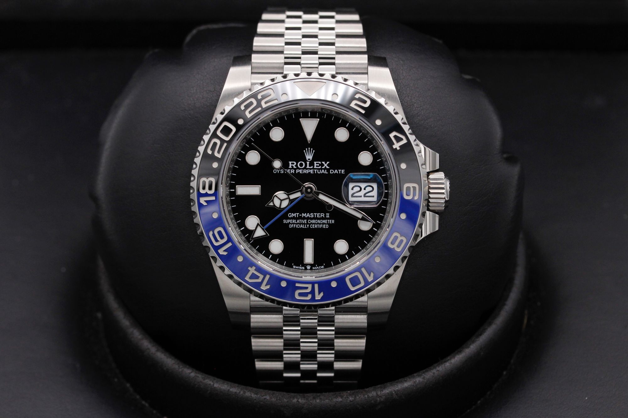 This Rolex GMT Master II 126710 BLNR has a black dial and a bracelet strap. This Rolex has undergone a thorough inspection of water resistance, accuracy, functionality and condition to determine the level of reconditioning required to meet our strict standards. It has also been referenced against technical documents and manufacturer records where available to ensure authenticity and a clean history. Our watches have a 24-month warranty for your peace of mind, in conjunction with any remaining manufacturer’s warranty from new or from service. To maintain the manufacturer’s warranty on this watch, it has not been polished in our service centre.