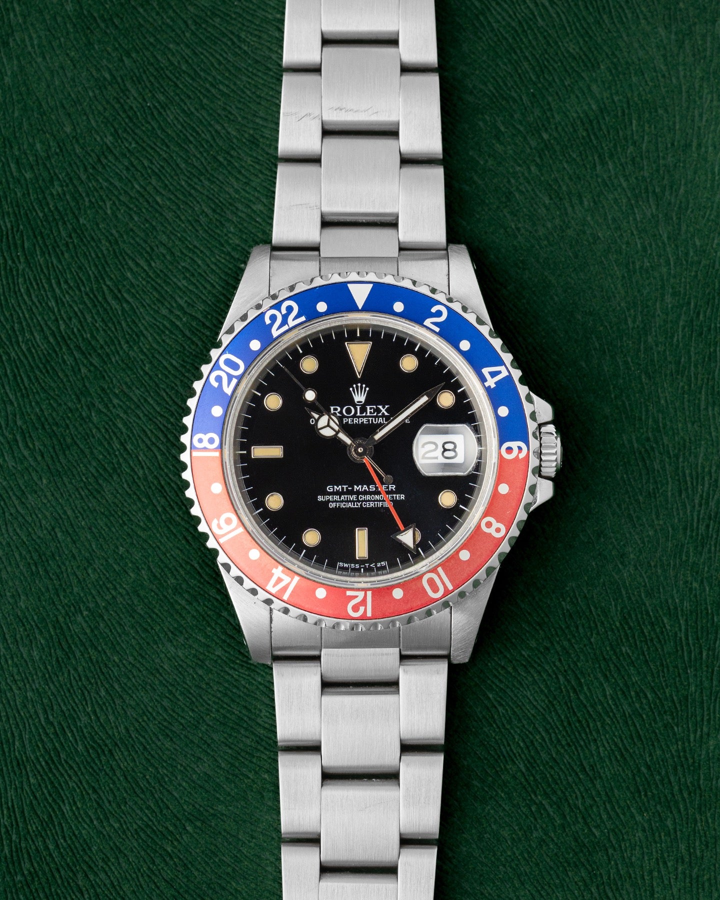 The GMT Master was first commissioned in the 1950s by pioneering airline Pan Am, and was designed for aviation. An increase in flight distances created demand for a watch that was able to tell the time in two different parts of the world simultaneously, so Rolex built it with an additional hand set to a 24-hour display on the rotating bezel. By the 1980s, the watch had developed into the GMT Master II, but Rolex continued to produce and improve the original Master pieces concurrently, resulting in the Ref. 16700 that ran from 1988 to 1999. The 16700 introduced innovations such as sapphire crystal, white gold indexes and a new steel case.