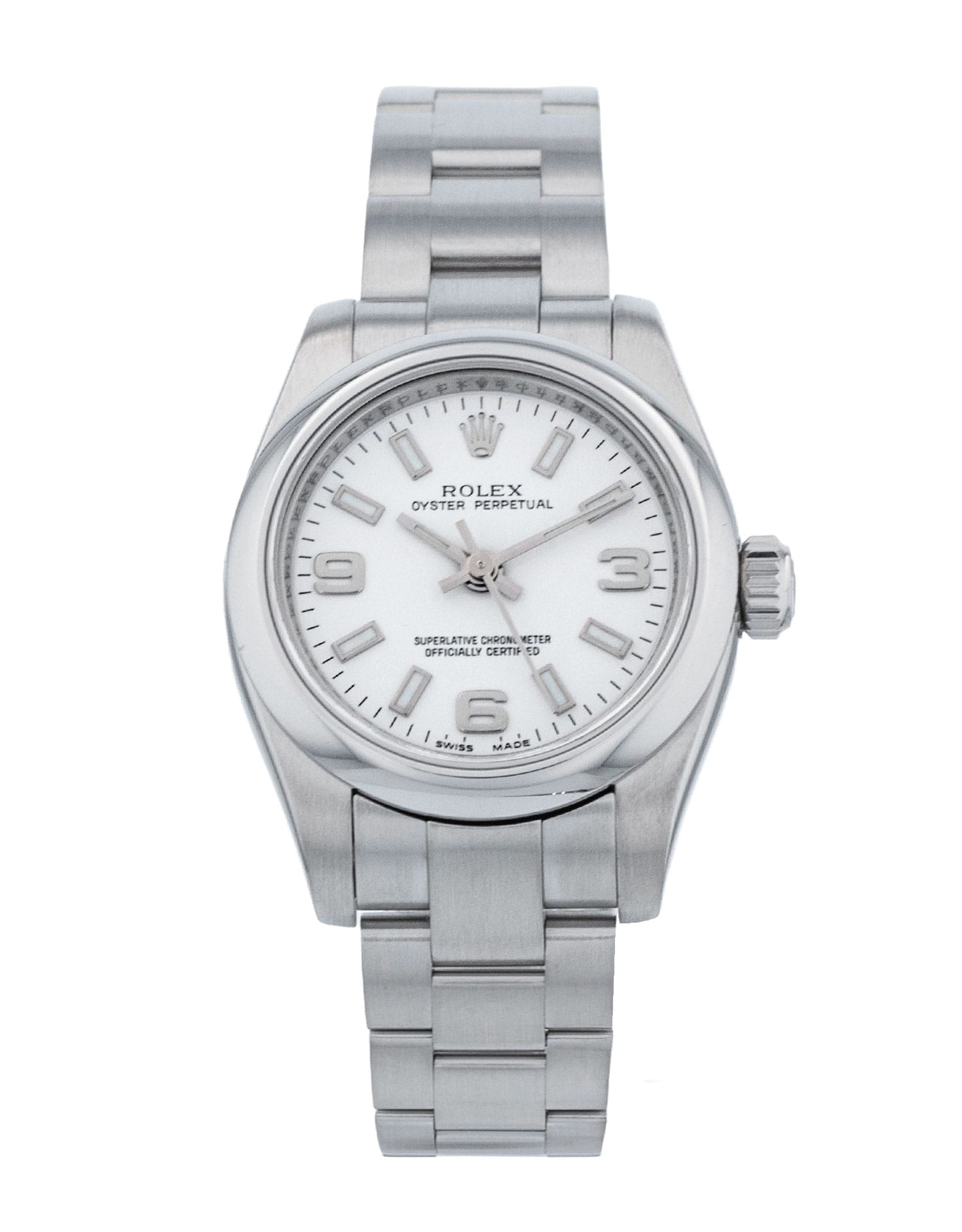 This Rolex Lady Oyster Perpetual 176200 has a white quarter arabic dial and a bracelet strap. This Rolex has undergone a thorough inspection of water resistance, accuracy, functionality and condition to determine the level of reconditioning required to meet our strict standards. It has also been referenced against technical documents and manufacturer records where available to ensure authenticity and a clean history. All our watches have a 24-month warranty for your peace of mind. One of our skilled polishing technicians has removed marks on the case and bracelet of this watch, brought about by daily wear and tear, which is why this watch does not come with the remaining manufacturer’s warranty.