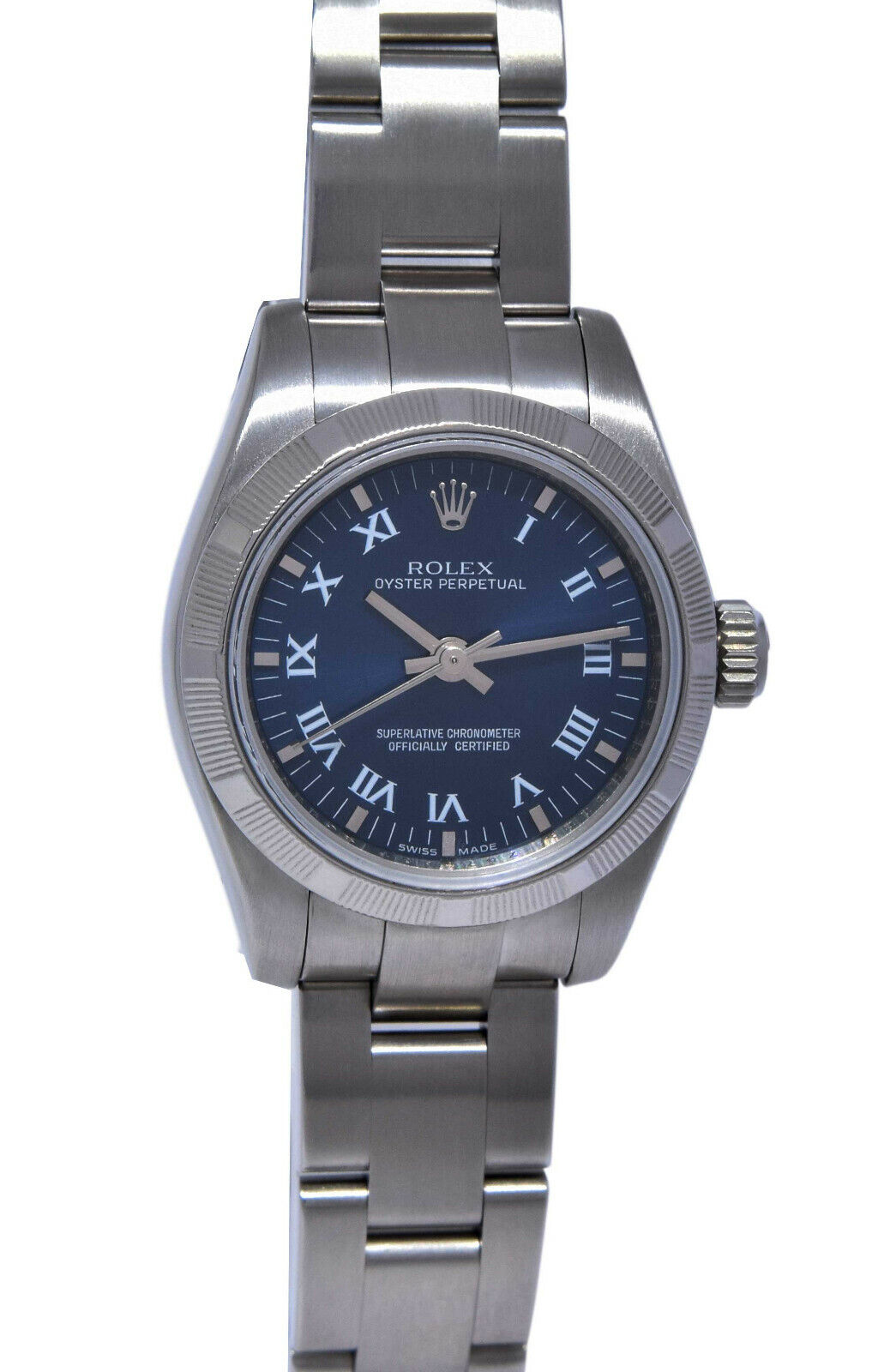This Rolex Lady Oyster Perpetual 176210 has a blue roman numeral dial and a bracelet strap. This Rolex has undergone a thorough inspection of water resistance, accuracy, functionality and condition to determine the level of reconditioning required to meet our strict standards. It has also been referenced against technical documents and manufacturer records where available to ensure authenticity and a clean history. All our watches have a 24-month warranty for your peace of mind. One of our skilled polishing technicians has removed marks on the case and bracelet of this watch, brought about by daily wear and tear, which is why this watch does not come with the remaining manufacturer’s warranty.