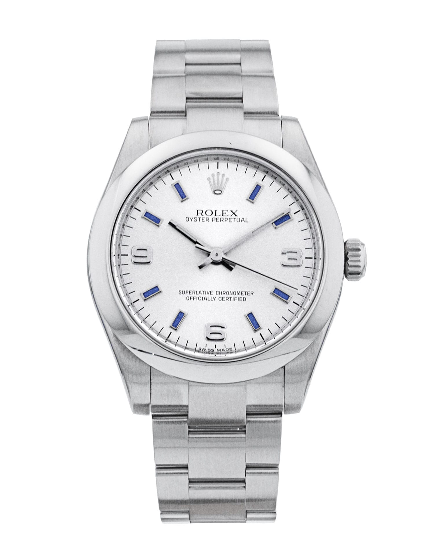 This Rolex Lady Oyster Perpetual 177200 has a silver quarter arabic dial and a bracelet strap. This Rolex has undergone a thorough inspection of water resistance, accuracy, functionality and condition to determine the level of reconditioning required to meet our strict standards. It has also been referenced against technical documents and manufacturer records where available to ensure authenticity and a clean history. All our watches have a 24-month warranty for your peace of mind. One of our skilled polishing technicians has removed marks on the case and bracelet of this watch, brought about by daily wear and tear, which is why this watch does not come with the remaining manufacturer’s warranty.