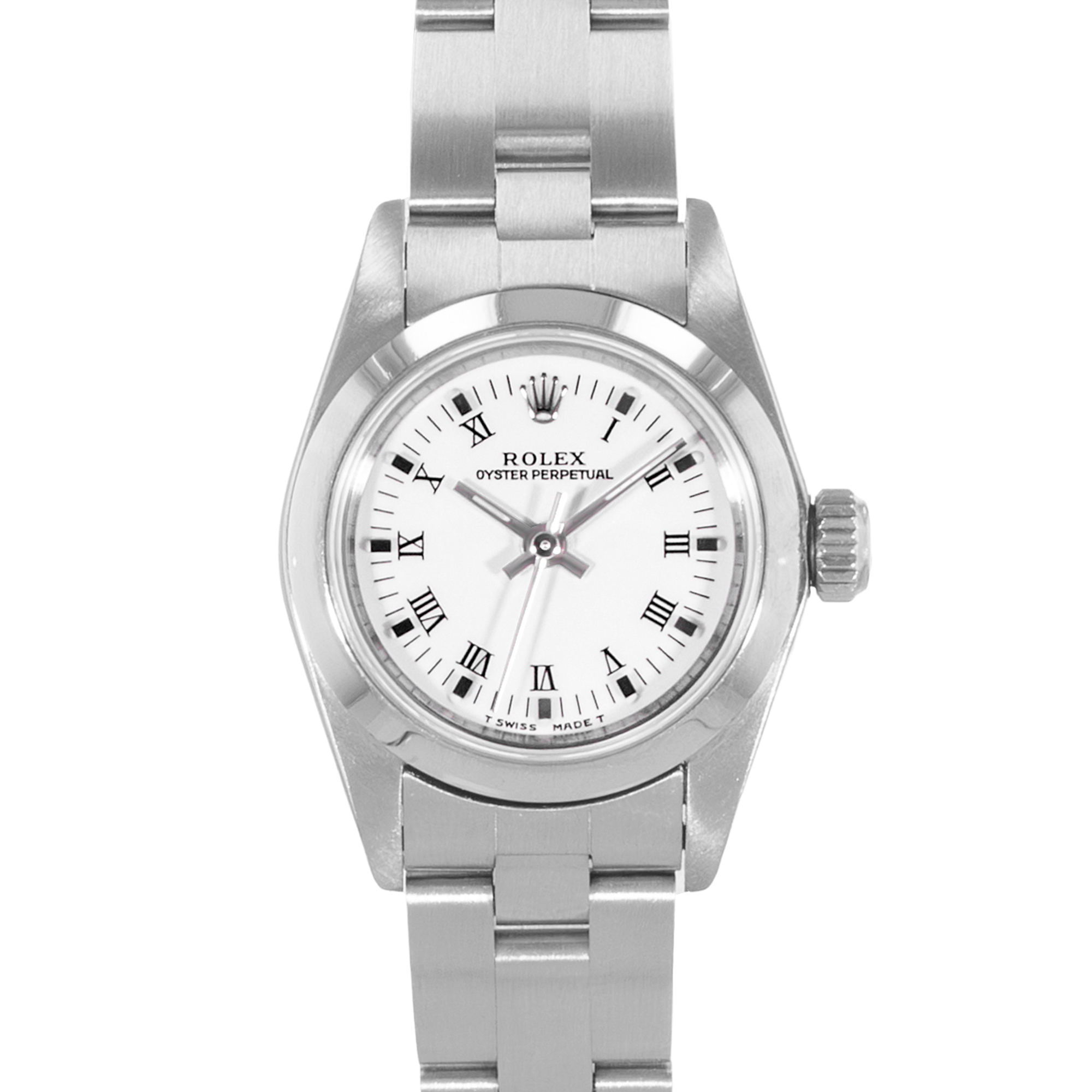 This Rolex Lady Oyster Perpetual 67180 has a white roman numeral dial and a bracelet strap. This Rolex has undergone a thorough inspection of water resistance, accuracy, functionality and condition to determine the level of reconditioning required to meet our strict standards. It has also been referenced against technical documents and manufacturer records where available to ensure authenticity and a clean history. All our watches have a 24-month warranty for your peace of mind. One of our skilled polishing technicians has removed marks on the case and bracelet of this watch, brought about by daily wear and tear, which is why this watch does not come with the remaining manufacturer’s warranty.