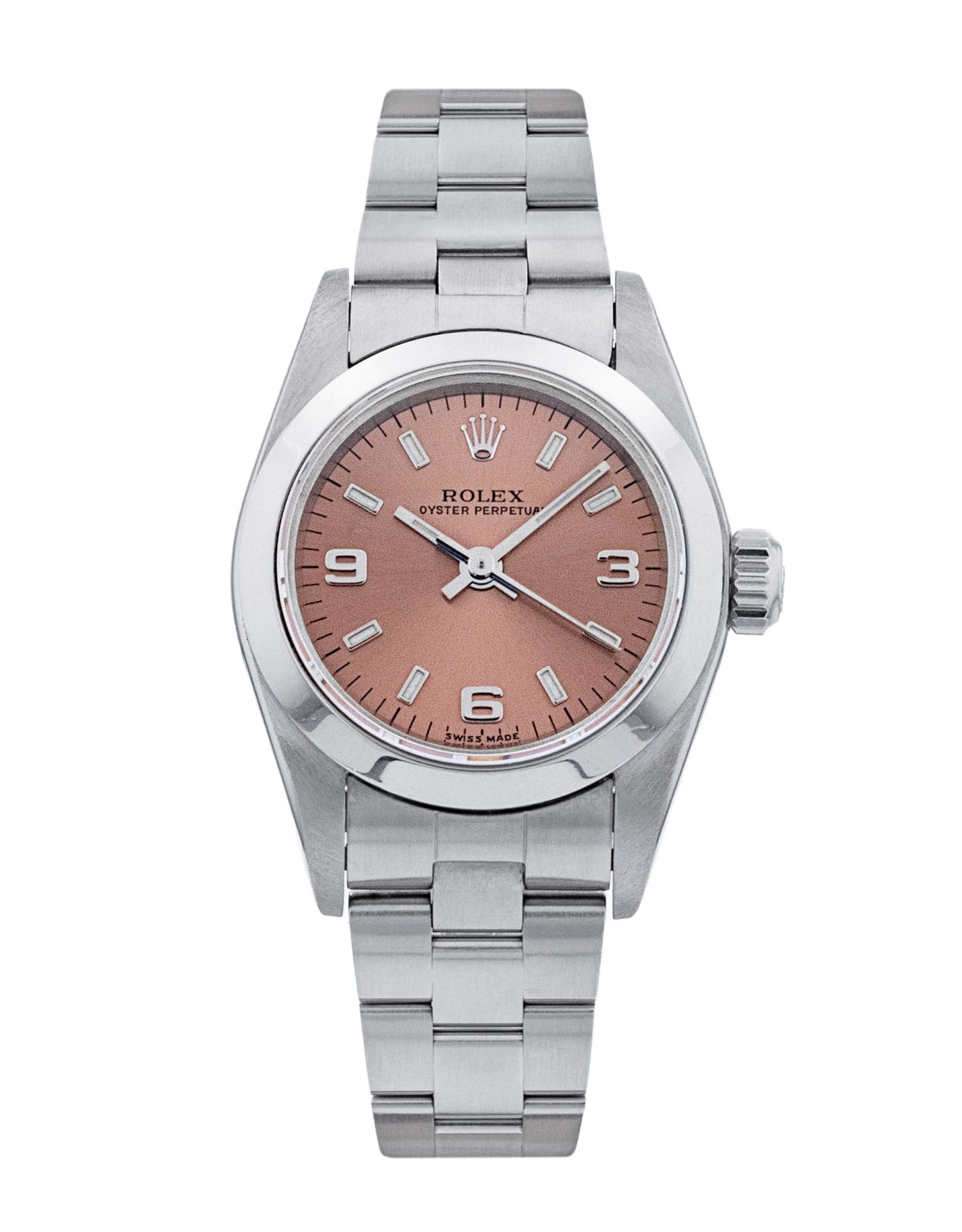 This Rolex Lady Oyster Perpetual 67180 has a salmon quarter arabic dial and a bracelet strap. This Rolex has undergone a thorough inspection of water resistance, accuracy, functionality and condition to determine the level of reconditioning required to meet our strict standards. It has also been referenced against technical documents and manufacturer records where available to ensure authenticity and a clean history. All our watches have a 24-month warranty for your peace of mind. One of our skilled polishing technicians has removed marks on the case and bracelet of this watch, brought about by daily wear and tear, which is why this watch does not come with the remaining manufacturer’s warranty.