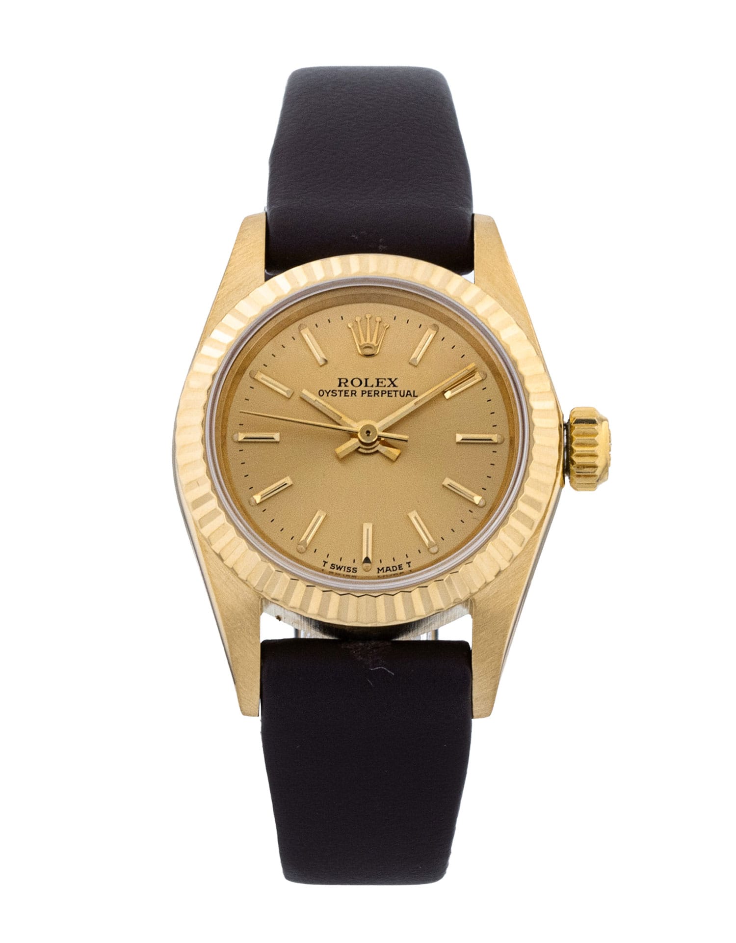 This Rolex Lady Oyster Perpetual 67198 has a champagne baton dial and a leather strap. This Rolex has undergone a thorough inspection of water resistance, accuracy, functionality and condition to determine the level of reconditioning required to meet our strict standards. It has also been referenced against technical documents and manufacturer records where available to ensure authenticity and a clean history. All our watches have a 24-month warranty for your peace of mind. One of our skilled polishing technicians has removed marks on the case and bracelet of this watch, brought about by daily wear and tear, which is why this watch does not come with the remaining manufacturer’s warranty.