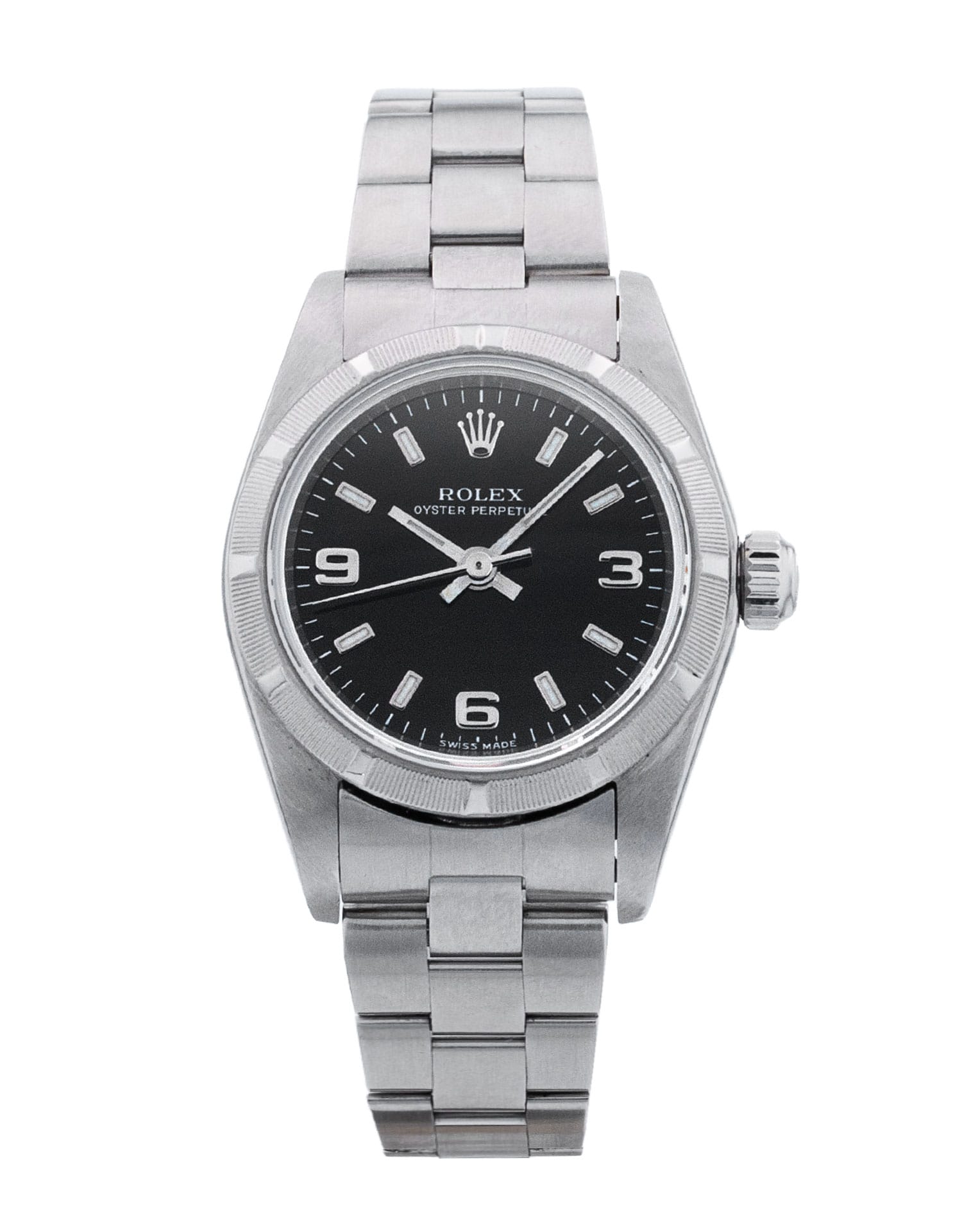 This Rolex Lady Oyster Perpetual 76030 has a black quarter arabic dial and a bracelet strap. This Rolex has undergone a thorough inspection of water resistance, accuracy, functionality and condition to determine the level of reconditioning required to meet our strict standards. It has also been referenced against technical documents and manufacturer records where available to ensure authenticity and a clean history. All our watches have a 24-month warranty for your peace of mind. One of our skilled polishing technicians has removed marks on the case and bracelet of this watch, brought about by daily wear and tear, which is why this watch does not come with the remaining manufacturer’s warranty.