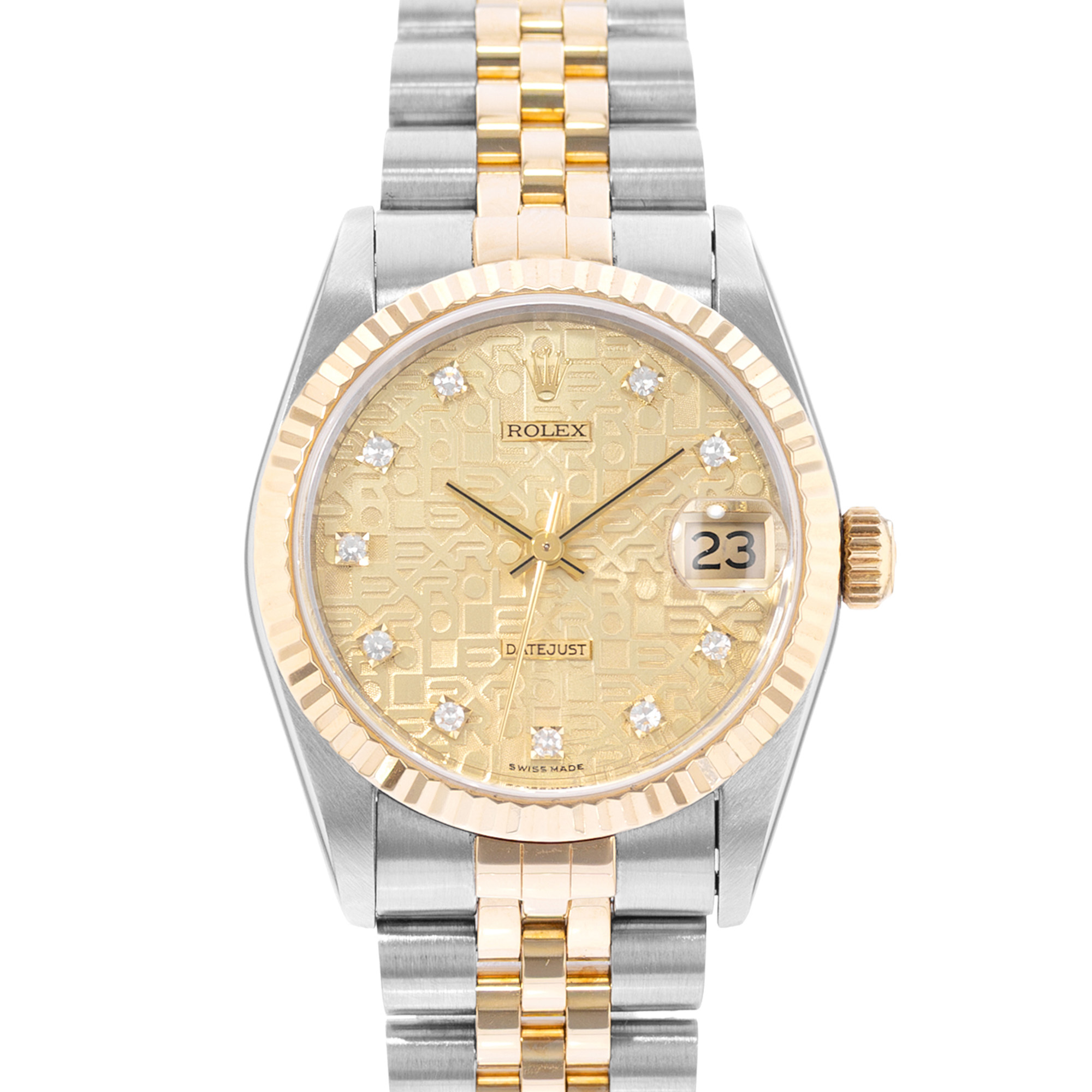 This Rolex Mid-Size Datejust 68273 has a champagne jubilee diamond dial and a bracelet strap. This Rolex has undergone a thorough inspection of water resistance, accuracy, functionality and condition to determine the level of reconditioning required to meet our strict standards. It has also been referenced against technical documents and manufacturer records where available to ensure authenticity and a clean history. All our watches have a 24-month warranty for your peace of mind. One of our skilled polishing technicians has removed marks on the case and bracelet of this watch, brought about by daily wear and tear, which is why this watch does not come with the remaining manufacturer’s warranty.