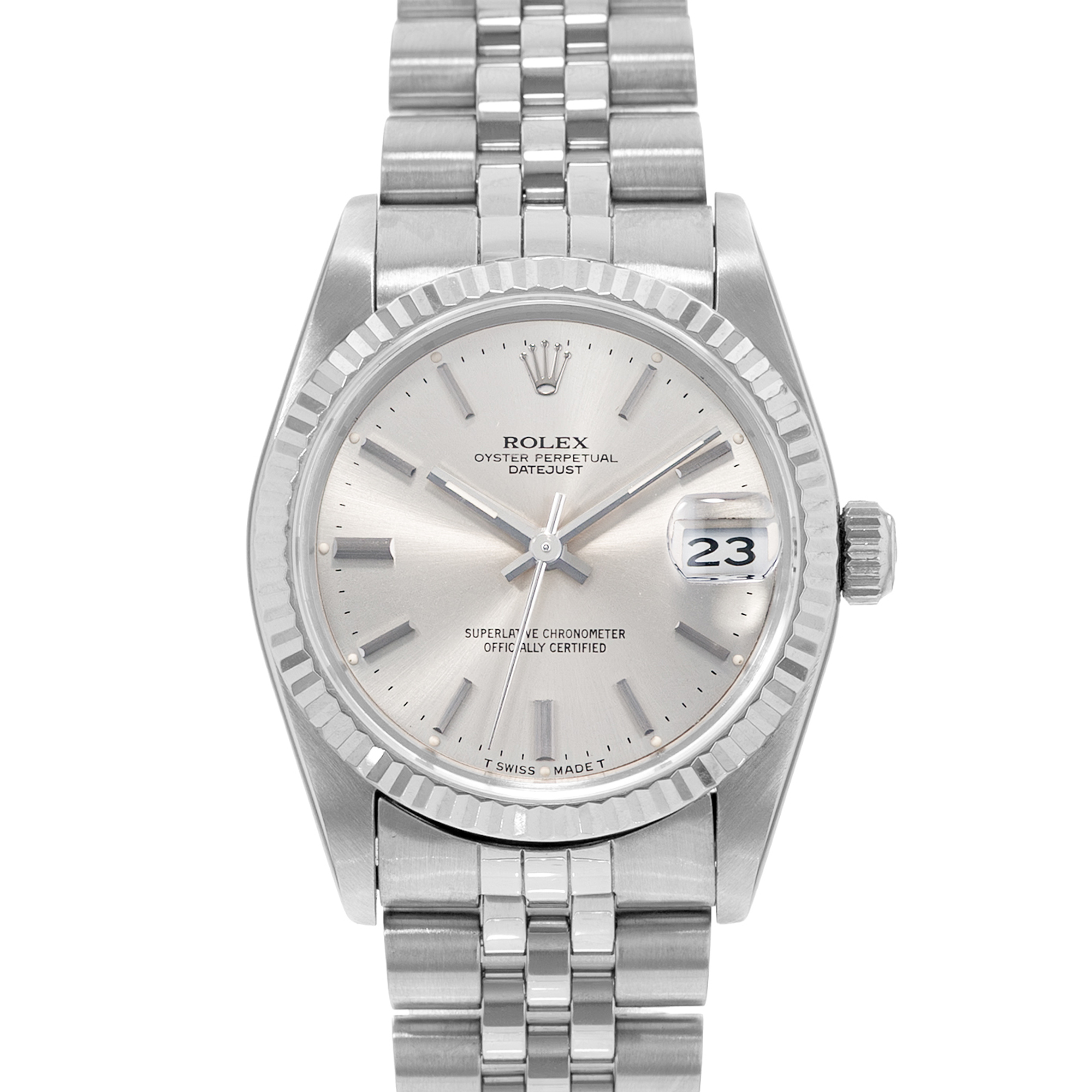 This Rolex Mid-Size Datejust 68274 has a silver baton dial and a bracelet strap. This Rolex has undergone a thorough inspection of water resistance, accuracy, functionality and condition to determine the level of reconditioning required to meet our strict standards. It has also been referenced against technical documents and manufacturer records where available to ensure authenticity and a clean history. All our watches have a 24-month warranty for your peace of mind. One of our skilled polishing technicians has removed marks on the case and bracelet of this watch, brought about by daily wear and tear, which is why this watch does not come with the remaining manufacturer’s warranty.