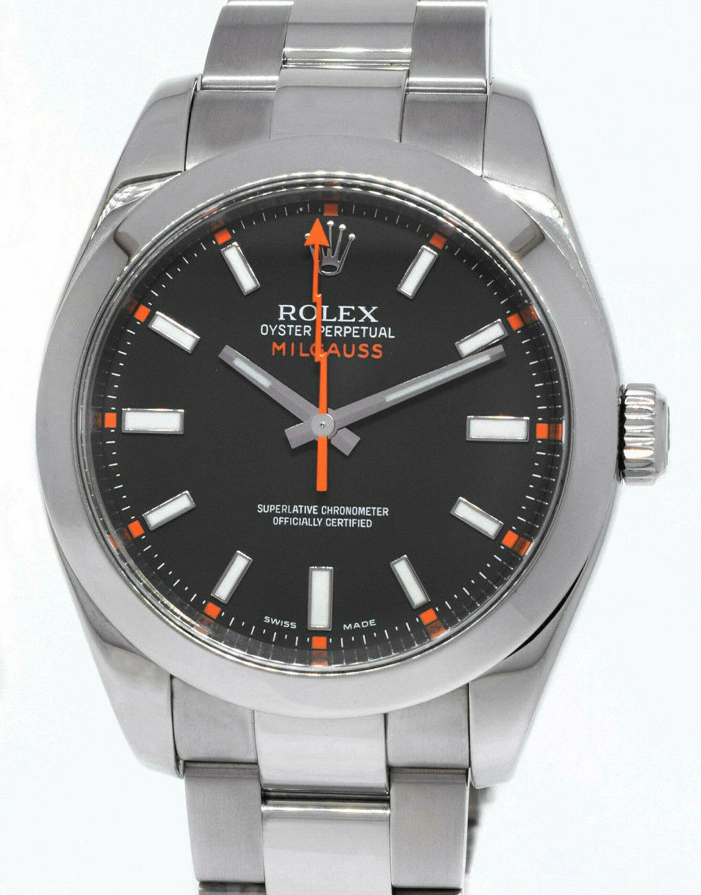 This Rolex Milgauss 116400 has a black baton dial and a bracelet strap. This Rolex has undergone a thorough inspection of water resistance, accuracy, functionality and condition to determine the level of reconditioning required to meet our strict standards. It has also been referenced against technical documents and manufacturer records where available to ensure authenticity and a clean history. All our watches have a 24-month warranty for your peace of mind. One of our skilled polishing technicians has removed marks on the case and bracelet of this watch, brought about by daily wear and tear, which is why this watch does not come with the remaining manufacturer’s warranty.