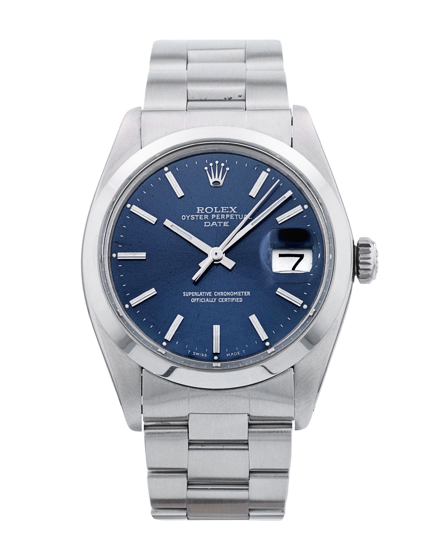 This Rolex Oyster Perpetual Date 15000 has a blue baton dial and a bracelet strap. This Rolex has undergone a thorough inspection of accuracy, functionality and condition to determine the level of reconditioning required to meet our strict standards. It has also been referenced against technical documents and manufacturer records where available to ensure authenticity and a clean history. Our watches have a 24-month warranty for your peace of mind, in conjunction with any remaining manufacturer’s warranty from new or from service. To maintain the manufacturer’s warranty on this watch, it has not been polished in our service centre.