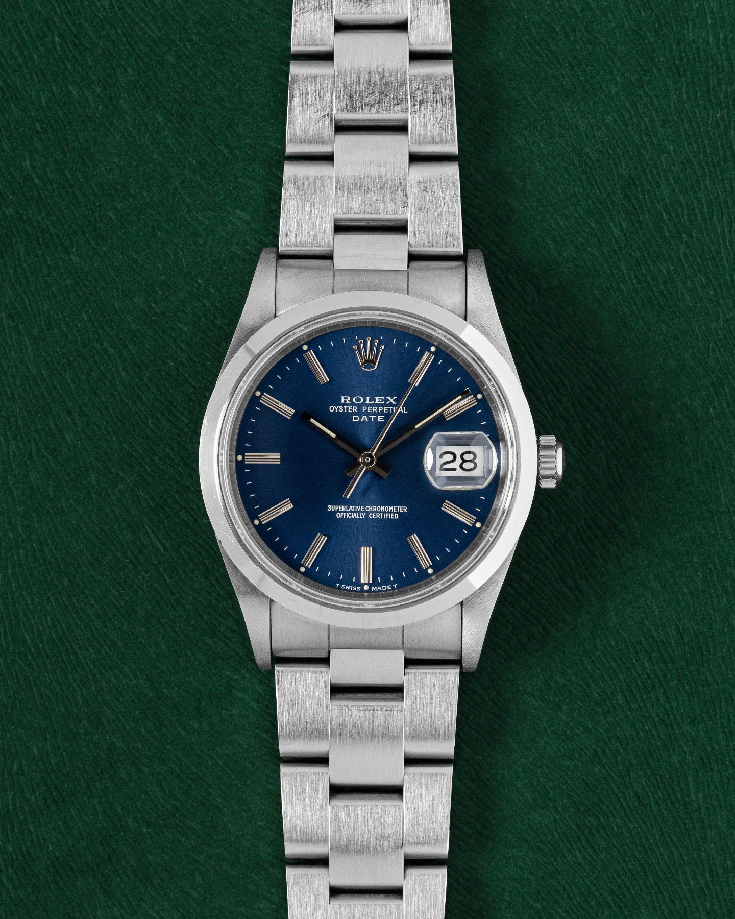 This Rolex Oyster Perpetual Date 15200 has a blue baton dial and a bracelet strap. This Rolex has undergone a thorough inspection of water resistance, accuracy, functionality and condition to determine the level of reconditioning required to meet our strict standards. It has also been referenced against technical documents and manufacturer records where available to ensure authenticity and a clean history. All our watches have a 24-month warranty for your peace of mind. One of our skilled polishing technicians has removed marks on the case and bracelet of this watch, brought about by daily wear and tear, which is why this watch does not come with the remaining manufacturer’s warranty.